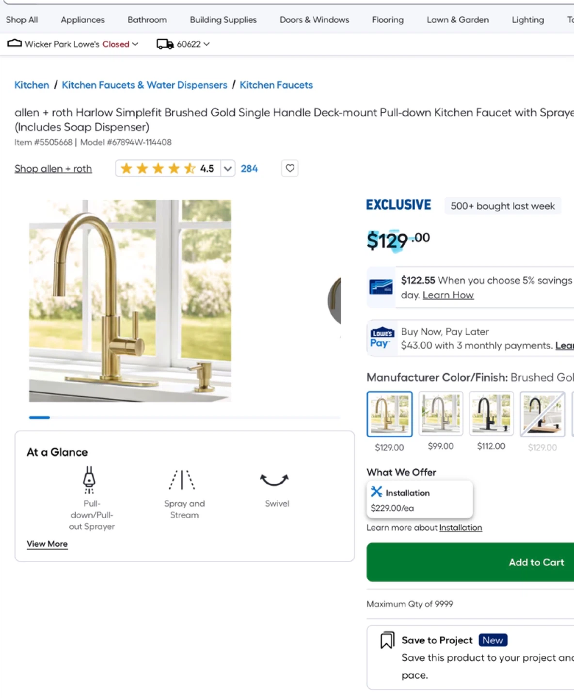 Brushed gold finish. Single handle deck-mount kitchen faucet. Includes pull-down sprayer and soap dispenser. Swivels for ease of use.