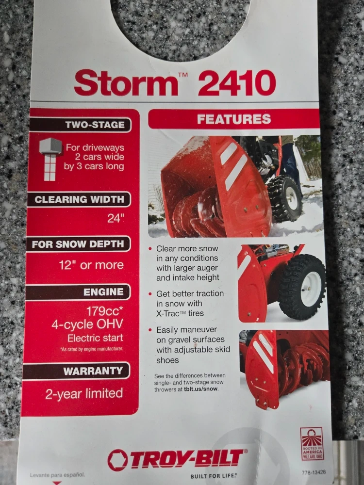 This is a Troy-Bilt Storm 2410 two-stage snow blower. It features a 179cc 4-cycle OHV engine with electric start. The clearing width is 24 inches and it's designed for snow depths of 12 inches or more. Get better traction in snow with X-Trac tires!