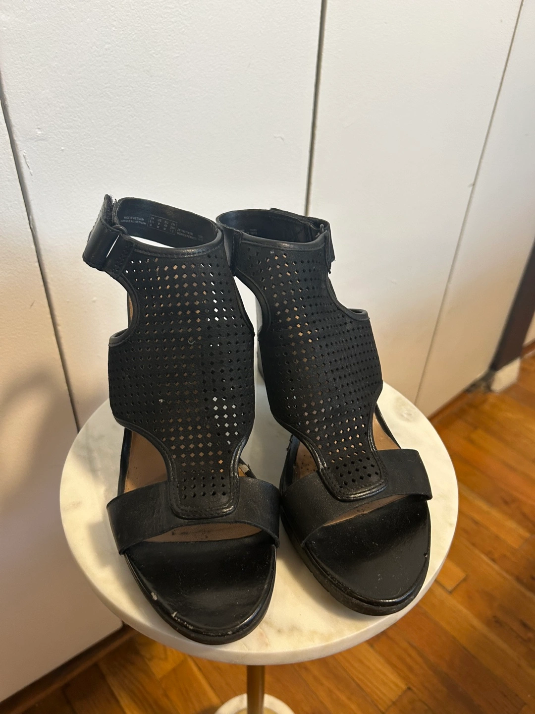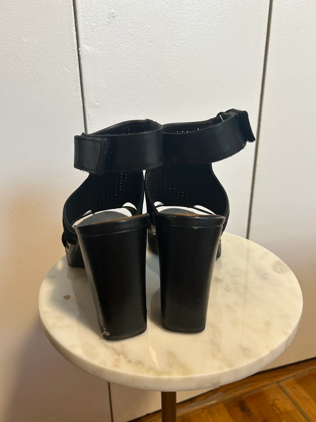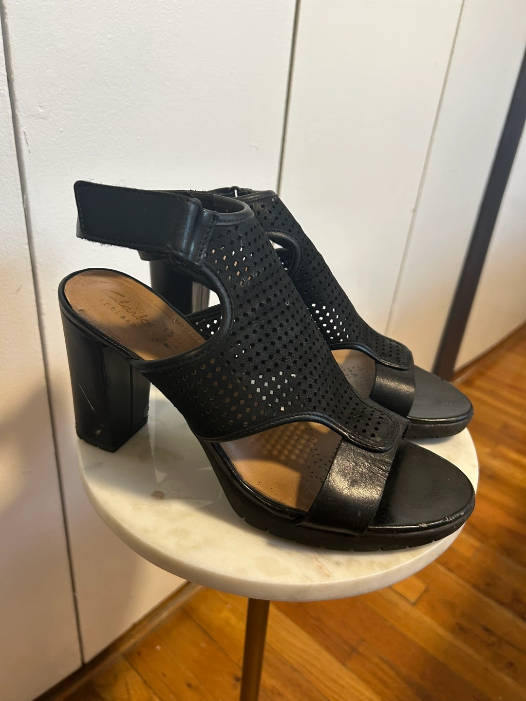 Selling a pair of Clarks black leather heeled sandals in size 8. These stylish sandals are perfect for dressing up or down. They have some signs of wear, but are still in good condition and ready for a new home!