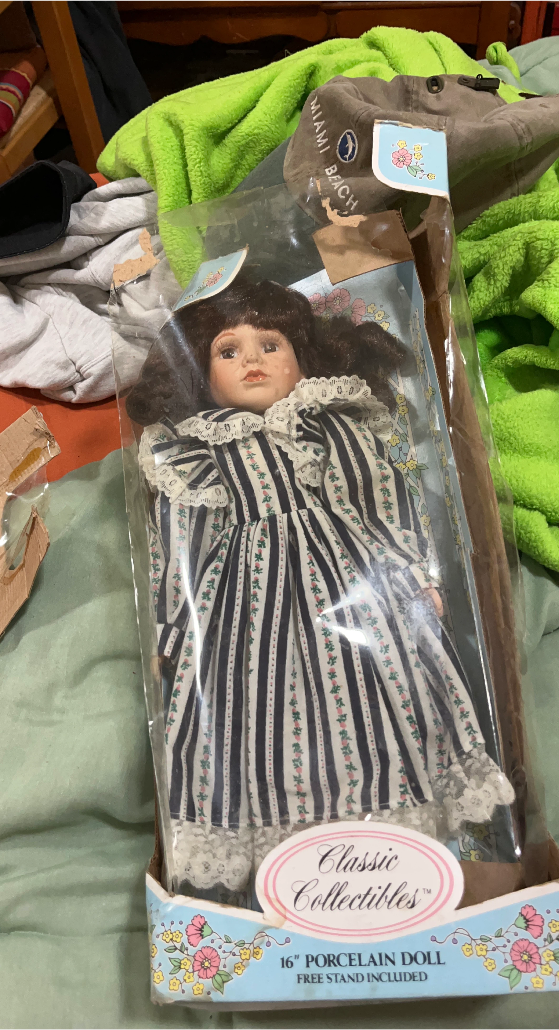 60Selling a Classic Collectibles 16" Porcelain Doll. It comes with a free stand included. The doll is still in its original packaging!