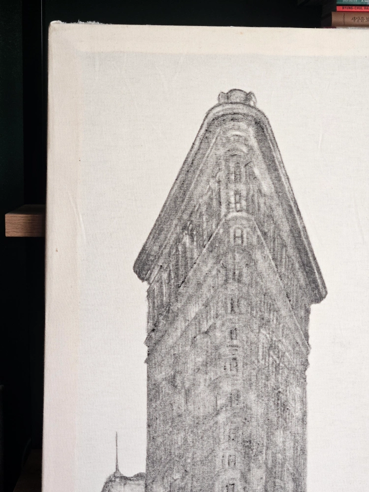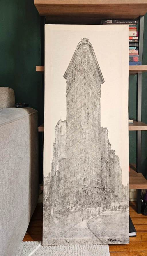 This classic Flatiron Building drawing will bring you true NYC vibes into your home! It's a monochrome mixed media drawing on canvas that is a subtle and quiet piece of art. I had an opportunity to find this beautiful drawing, 'Flatiron Building' by T. Barlow, in Union Square a long time ago. The art piece no longer fits in my current apartment, so I'm selling it here. The original price was around $300. Size: 18"W×42"H (portrait) Come and get it, art lovers! Cash and carry.