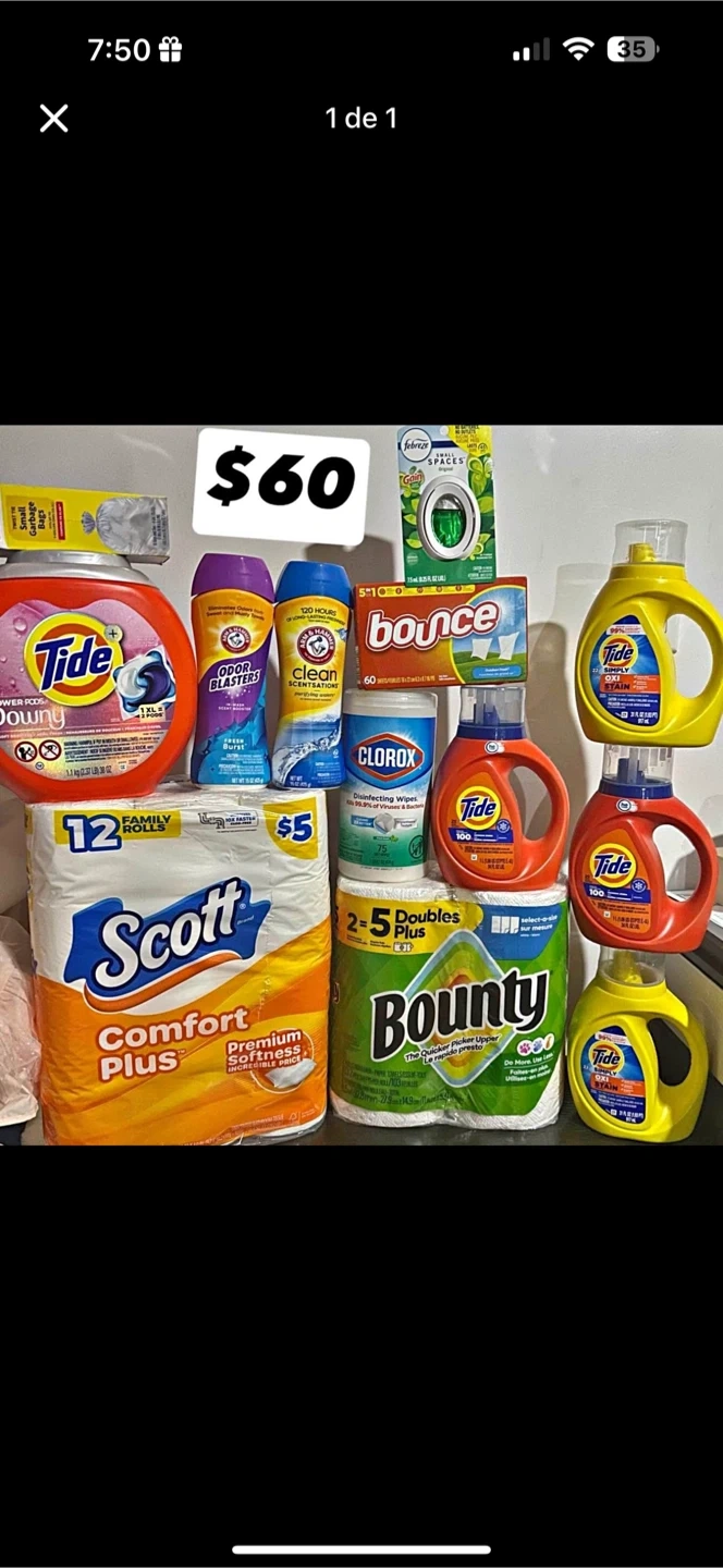 10Selling a bundle of various cleaning supplies! Includes: - Tide Power Pods with Downy - Arm & Hammer Odor Blasters - Arm & Hammer Clean Scentsations - Bounce Dryer Sheets (60 count) - Clorox Disinfecting Wipes - Scott Comfort Plus Toilet Paper (12 rolls) - Bounty Paper Towels - Tide Simply Oxi Stain - Febreze Small Spaces