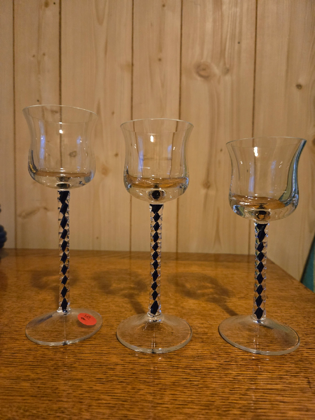 Here's a clear glass goblet with a unique black twist design on the stem. It's in great condition and would be a lovely addition to any table setting PartyLite
