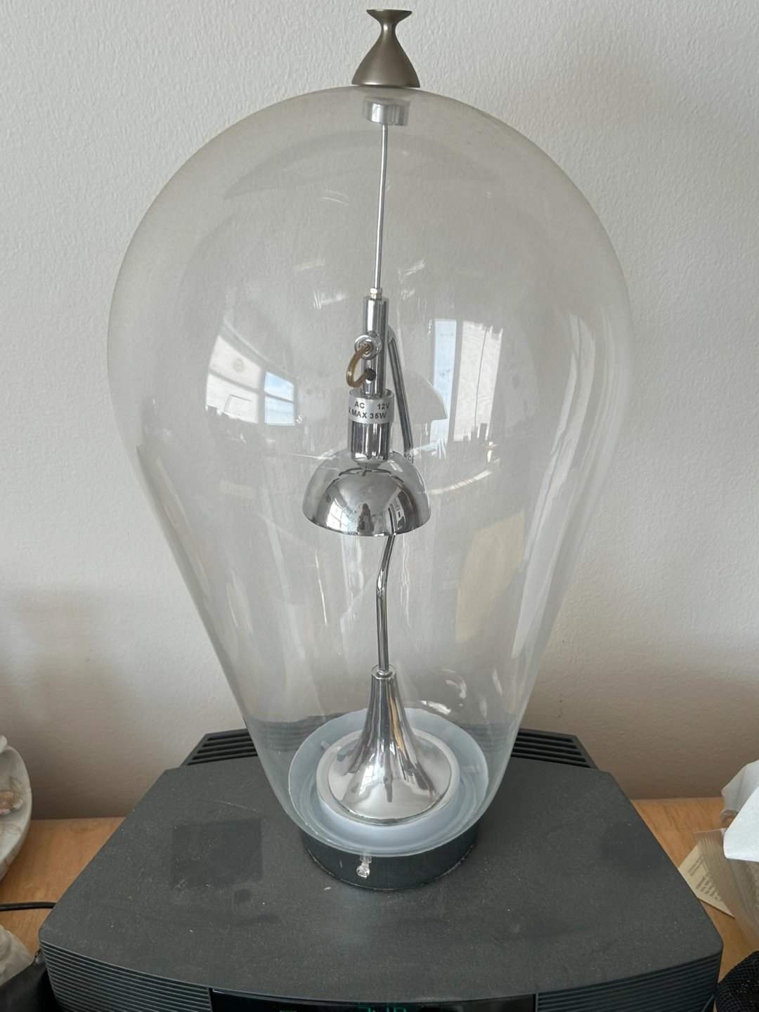 This is a clear glass table lamp with a silver-colored metal base and internal structure. The lamp has a teardrop-shaped glass enclosure. It adds a modern touch to any room!