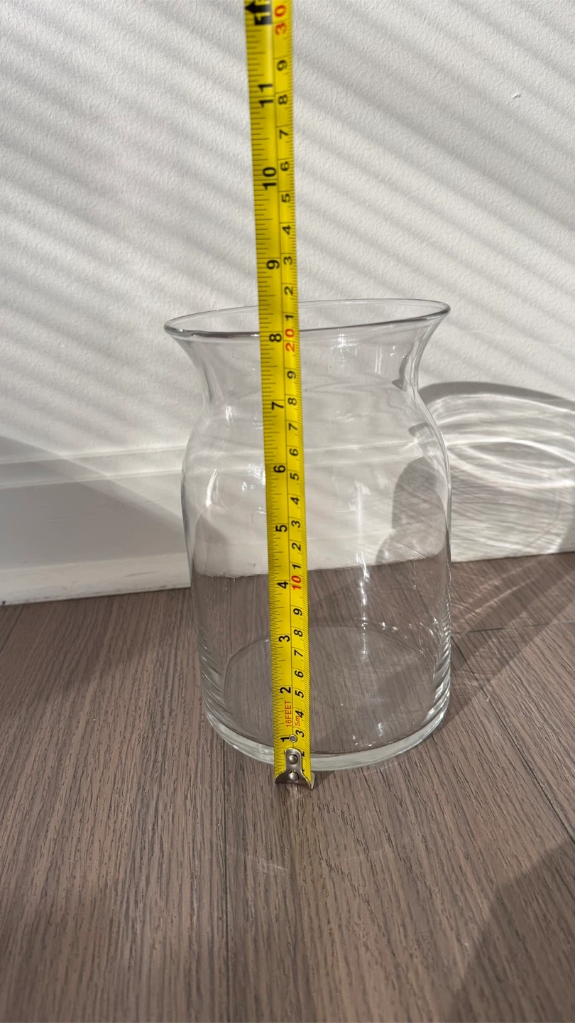 23Selling a clear glass vase. It has a 4-inch opening and stands about 11 inches tall. Perfect for displaying your favorite flowers!