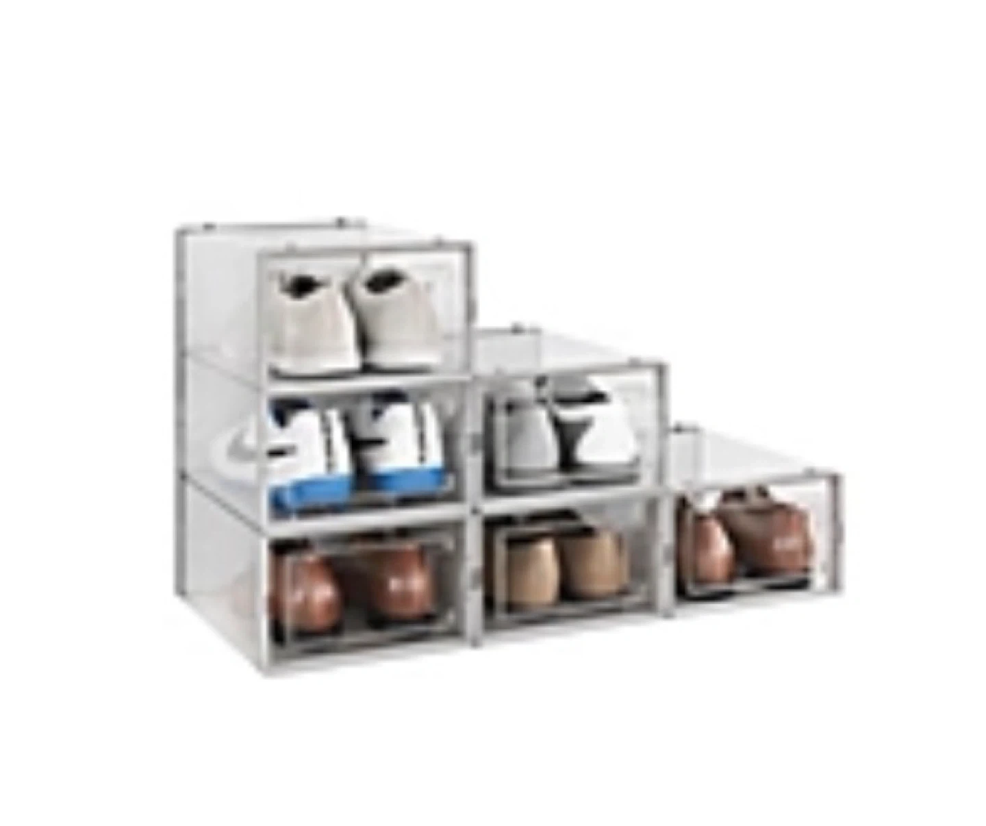10These clear shoe storage boxes are perfect for keeping your shoes organized and dust-free! They are stackable, so you can easily create a custom storage solution that fits your space. They appear to be in great condition and ready to use 12 boxes Swing Door