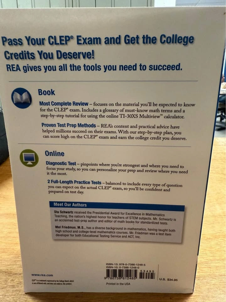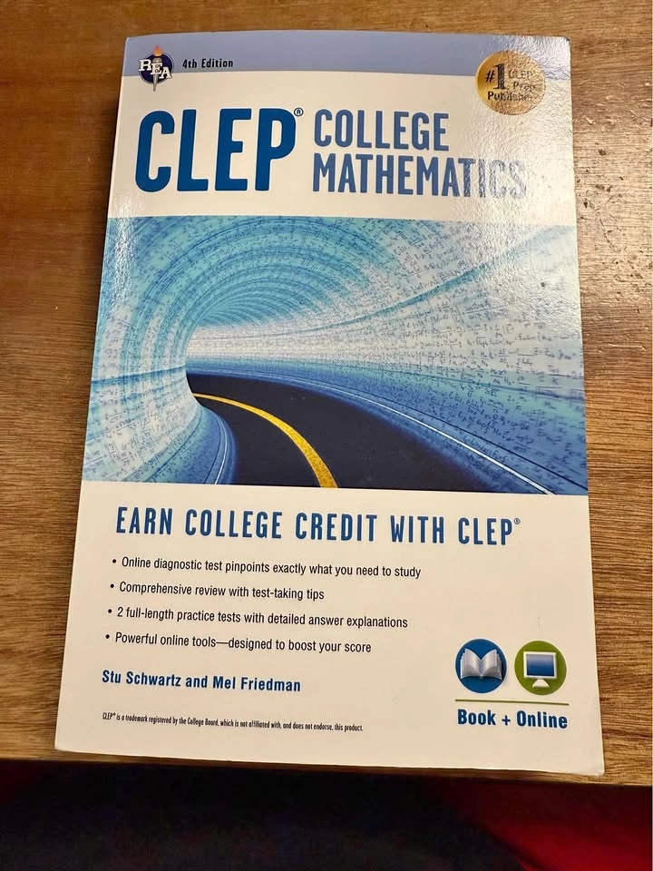 Ace your CLEP exam with this CLEP College Mathematics 4th Edition Study Guide – perfect for students preparing to earn college credit and skip math classes. Title: CLEP College Mathematics, 4th Edition Condition: Brand new – never used, no writing or highlighting Format: Paperback Perfect For: CLEP test prep, college students, independent learners Publisher: Stu Schwartz & Mel Friedman Includes: Practice problems, review sections, test-taking strategies 📘 Great for self-study and saving on college tuition! Get ahead academically and financially with this powerful prep guide!