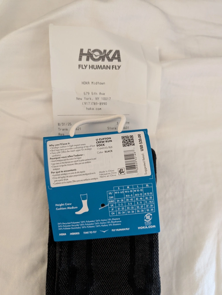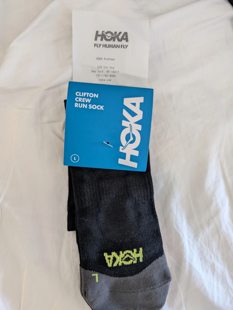Get ready to run with these Hoka Clifton Crew Run Socks! They are size L and in black. - Height: Crew - Cushion: Medium - Suggested Retail Price: USD $20.00 They're made with: - 56% Recycled Polyester - 36% Nylon - 8% Elastane Great Gift The crowd-fave Clifton running shoe meets its mate: the new Clifton Crew Run Sock. With cushioning and mesh ventilation zones that strategically correspond to its partner shoe, this synthetic-blend sock is lightweight and breathable for everyday miles. Ribbed arch support and a silicone strip along the ball of the foot keep it in place and the crew height pairs perfectly with the Clifton shoe design—a match made in sock heaven. Designed for: Everyday Run Walking 52% Recycled polyester, 44% nylon, 4% elastane blend Strategic cushioning at toe, heel, Achilles and top eyestay Clifton shoe-matching mesh ventilation zones Ribbed arch support Anti-slip silicone strip across ball of foot 52% Recycled Poly / 44% Nylon / 4% Elastane https://www.hoka.com/en/us/all-gender-apparel/clifton-crew-run-sock/1164333.html