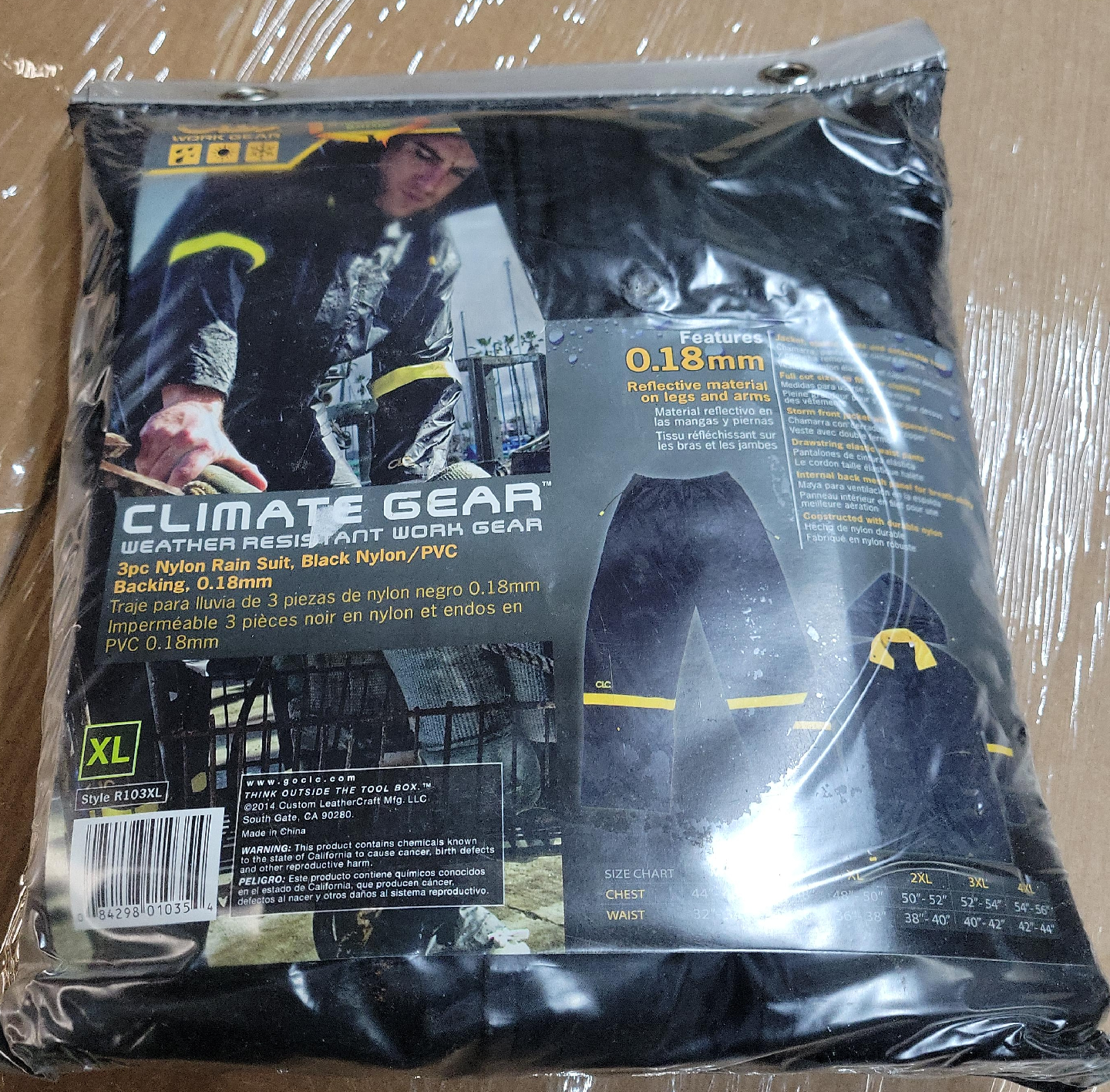 Selling a brand new Climate Gear weather-resistant work gear 3-piece nylon rain suit in black nylon/PVC. Size XL. Features 0.18mm reflective material on legs and arms. The suit is constructed with durable nylon and includes a storm front jacket with a drawstring elastic waist