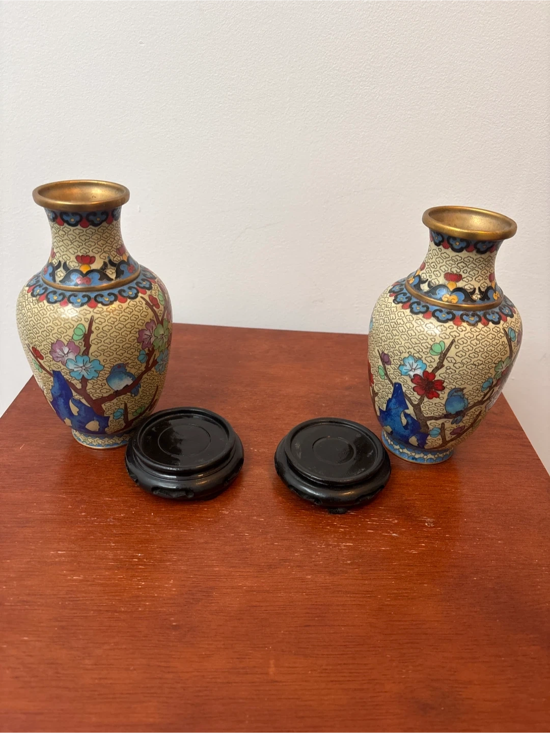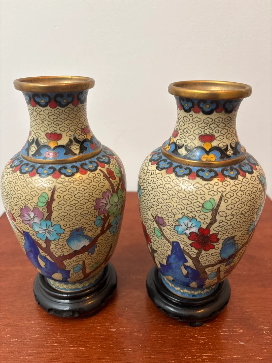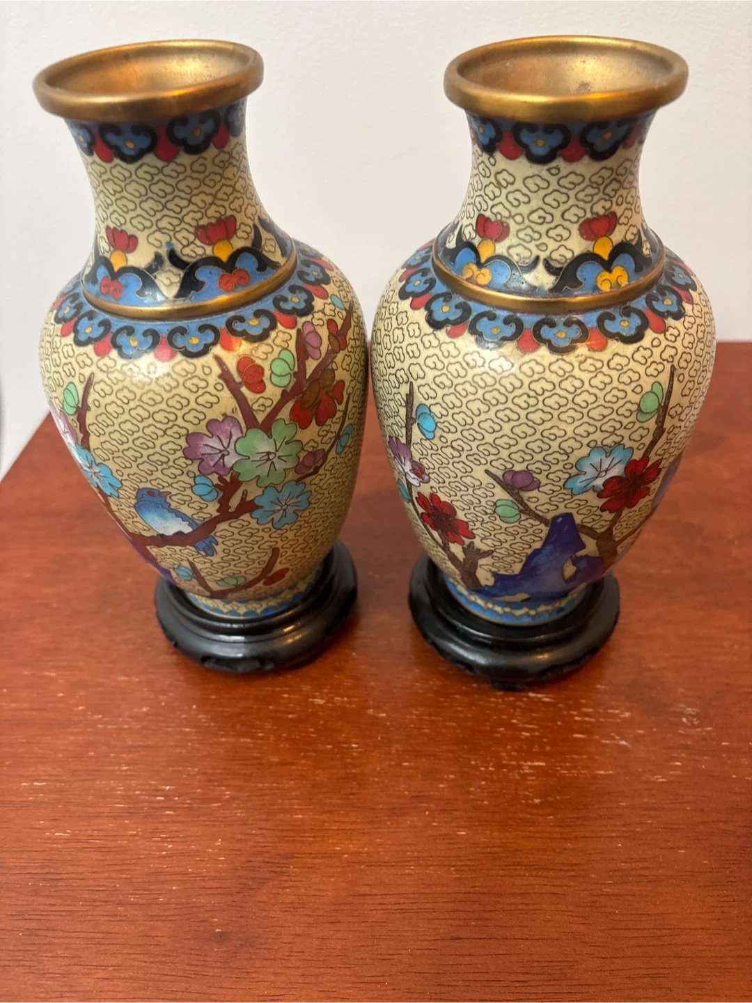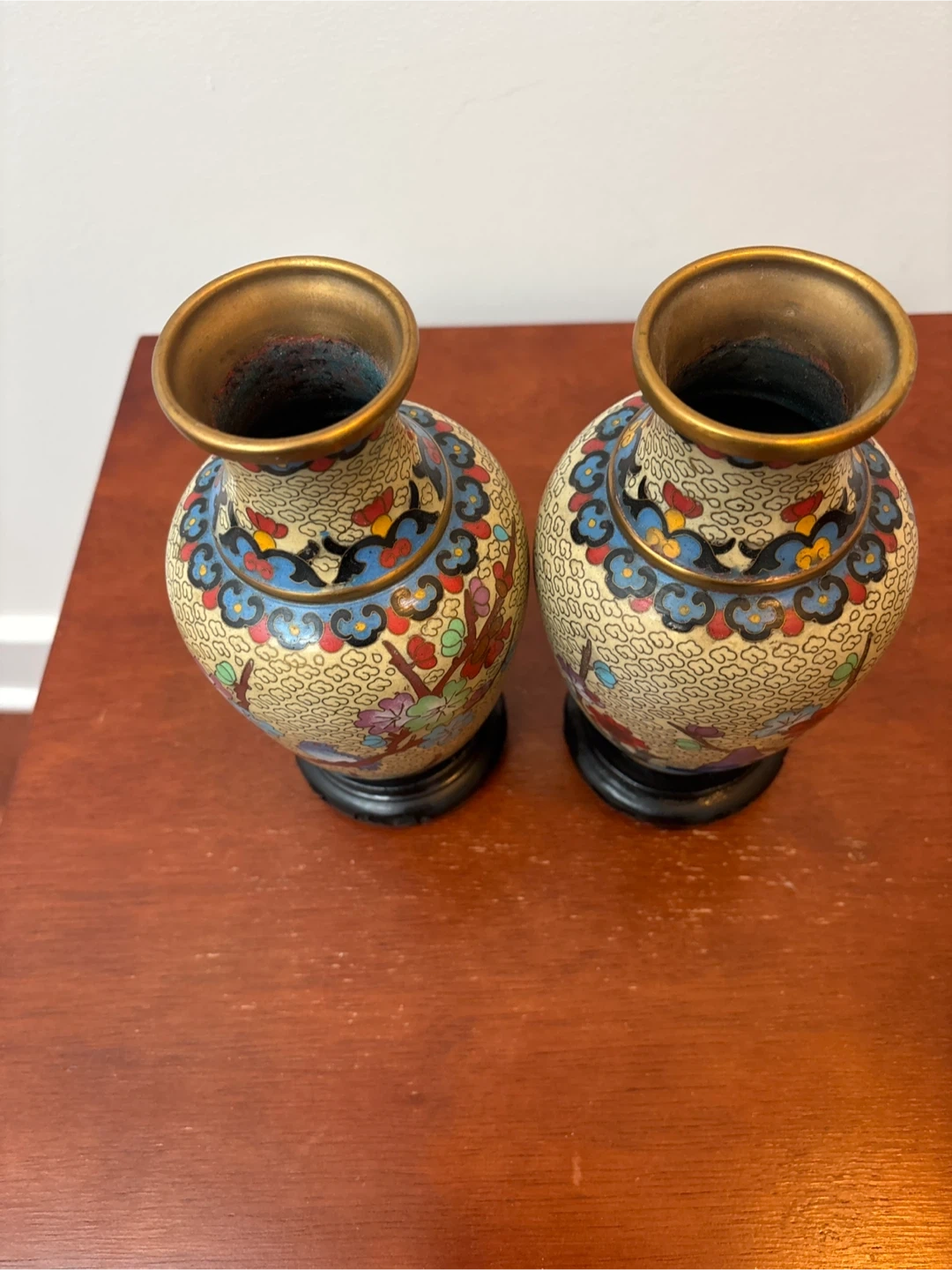 These are two beautiful cloisonné vases with a unique floral design. They come with black stands. They are in great condition and would look great in any home!