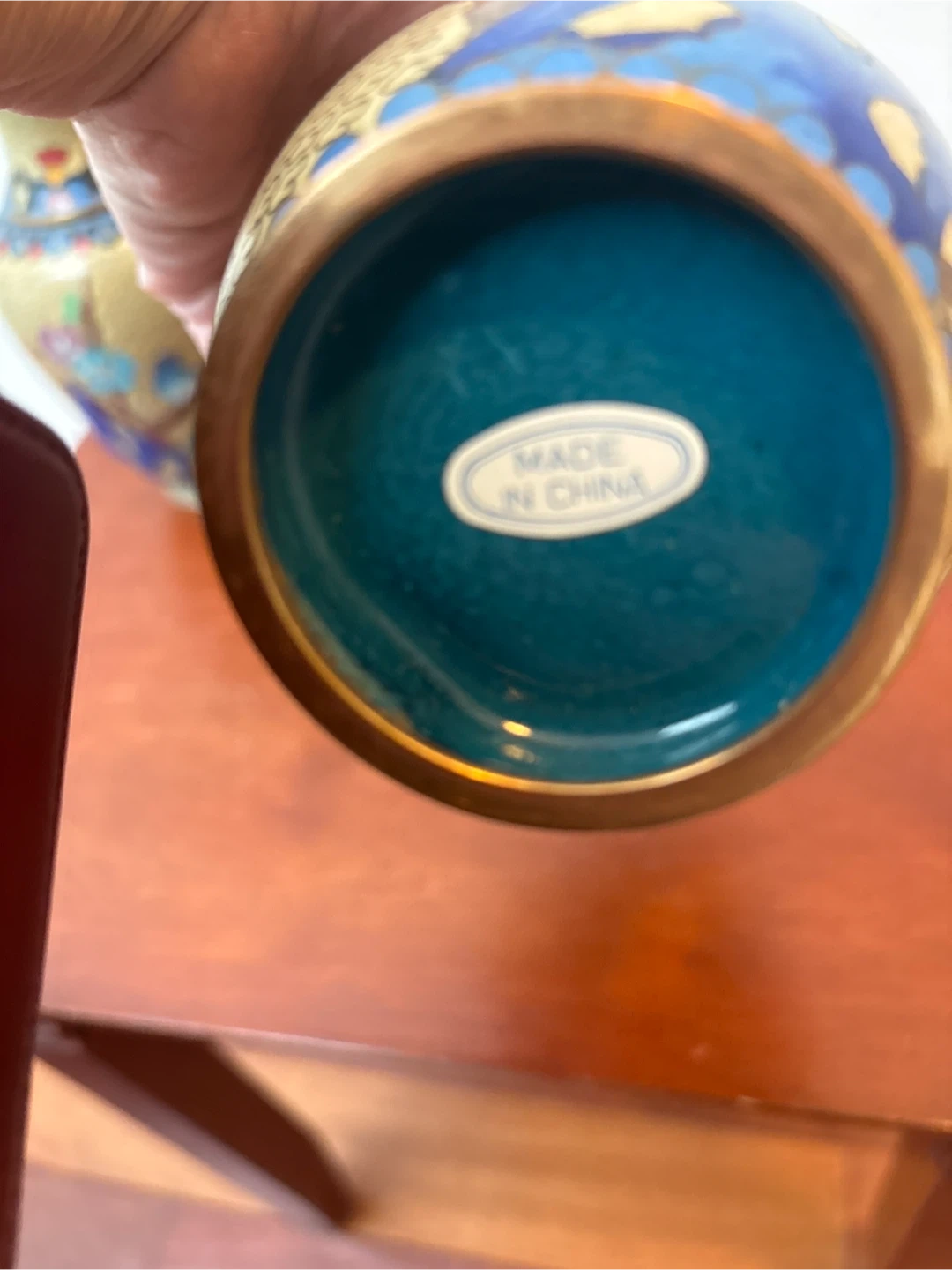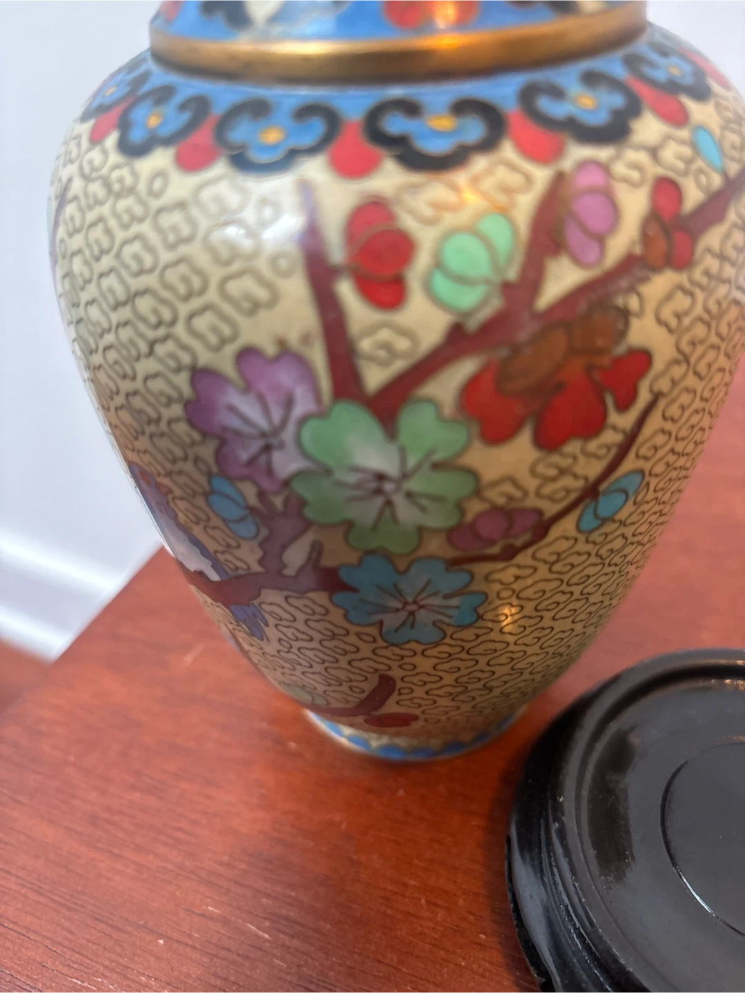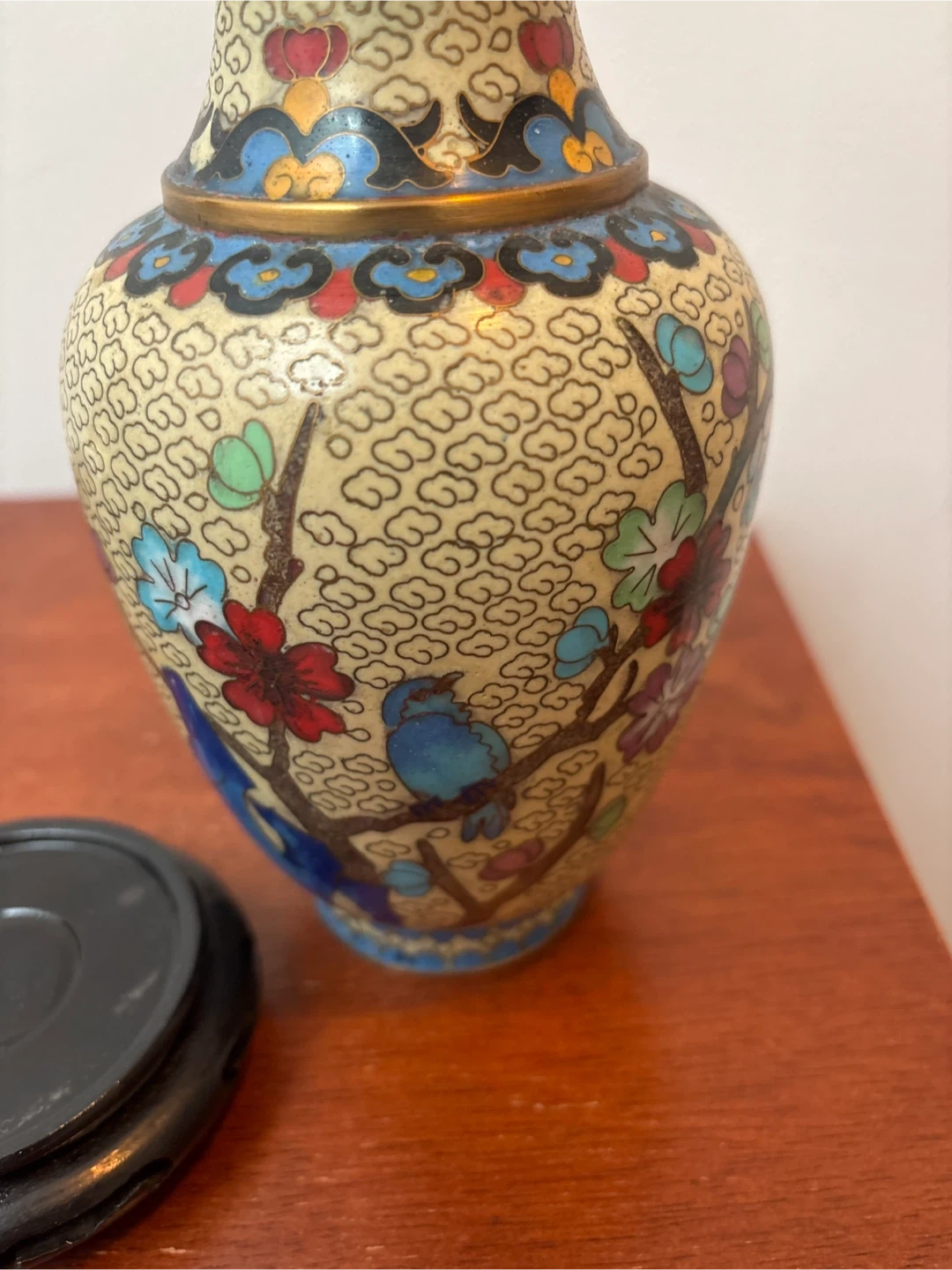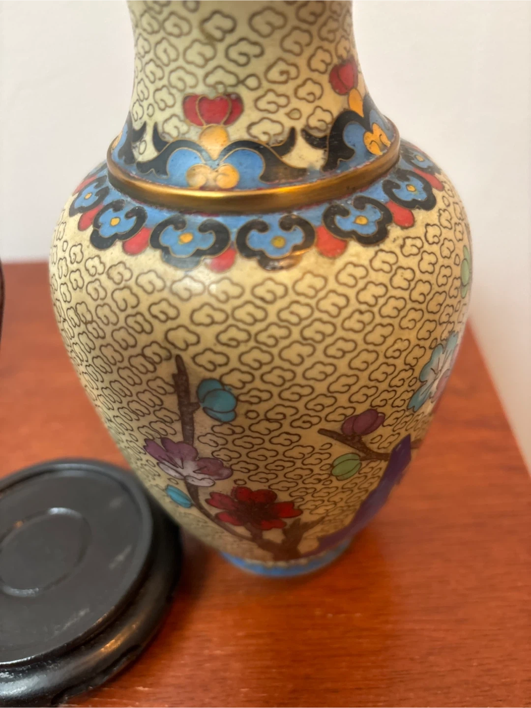These are two beautiful cloisonné vases with a unique floral design. They come with black stands. They are in great condition and would look great in any home!