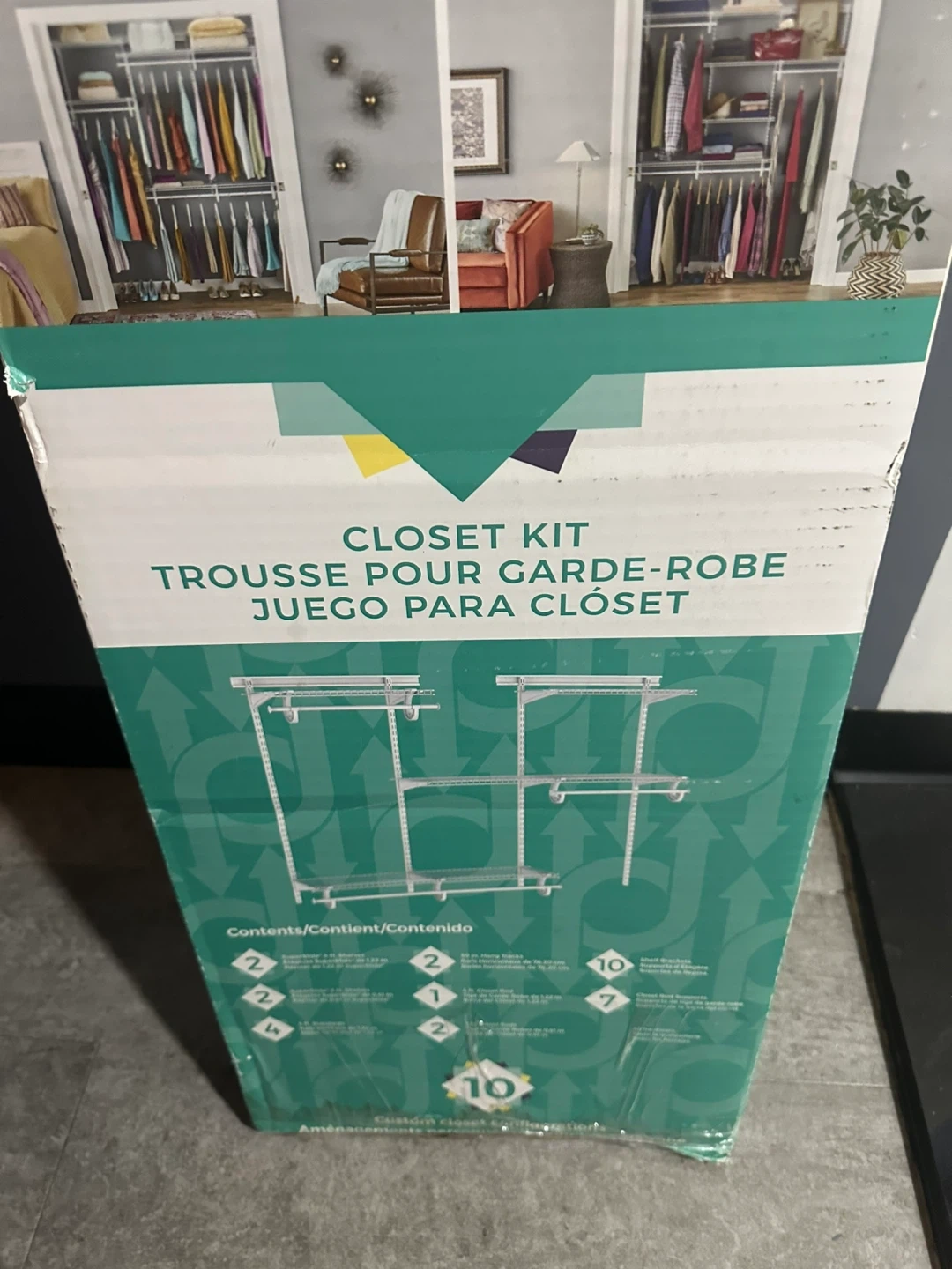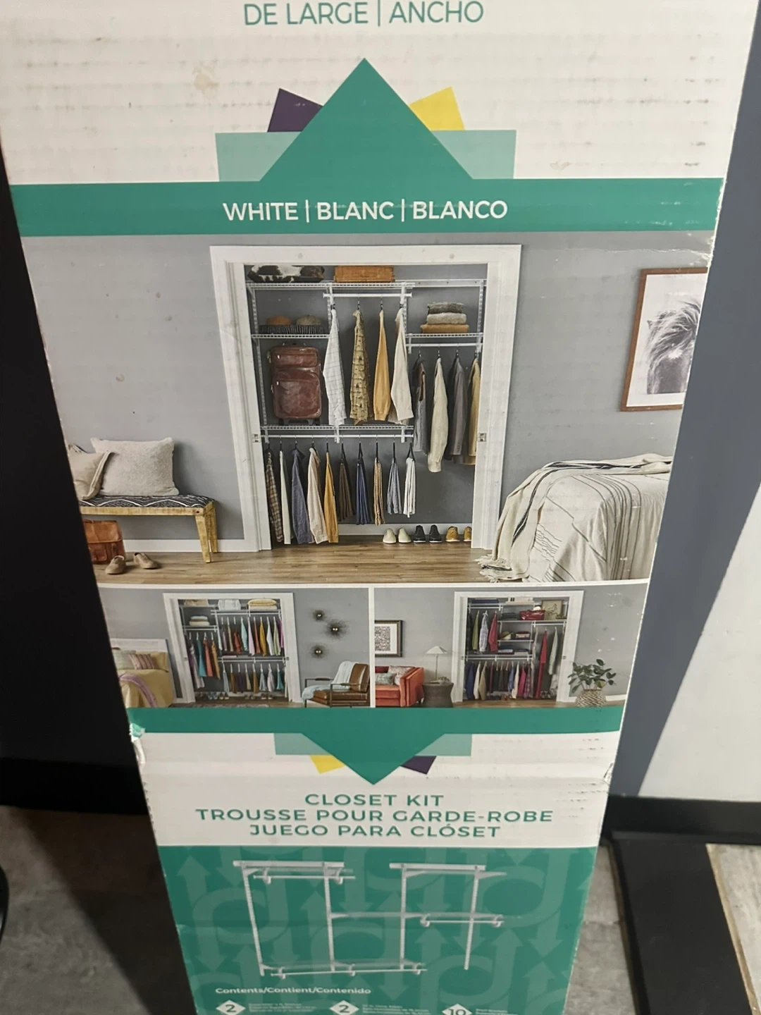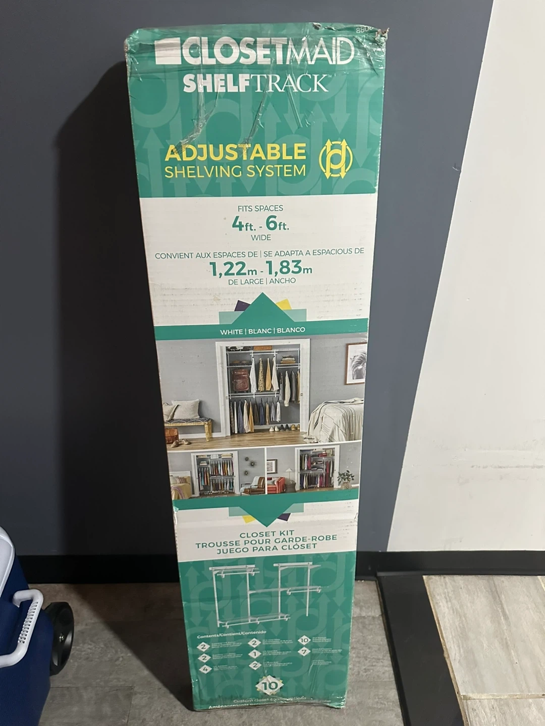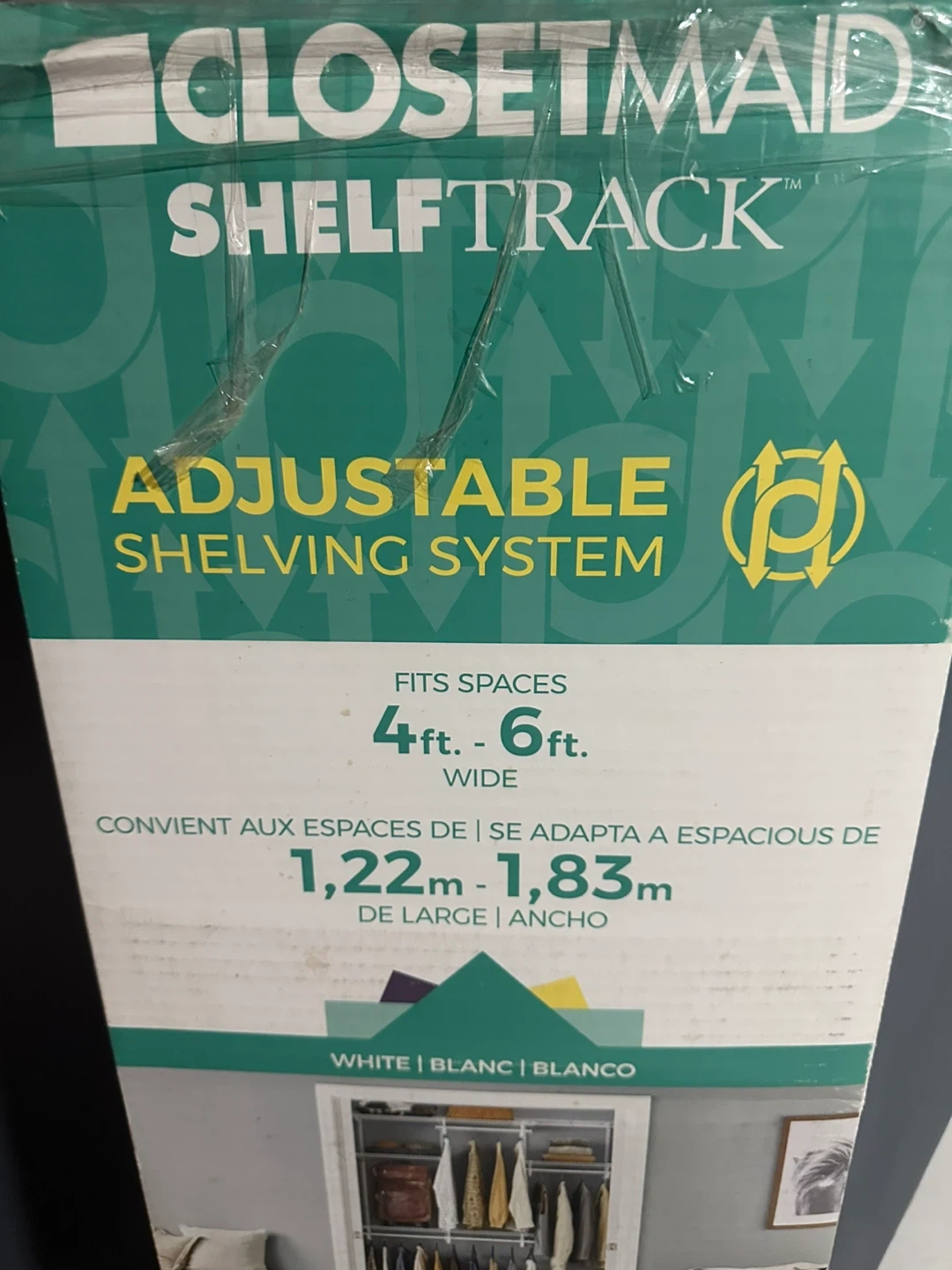 ClosetMaid ShelfTrack adjustable shelving system fits spaces 4ft - 6ft wide. It's a closet kit to help you organize your wardrobe! The color is white.
