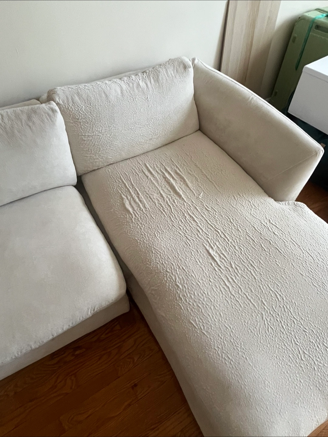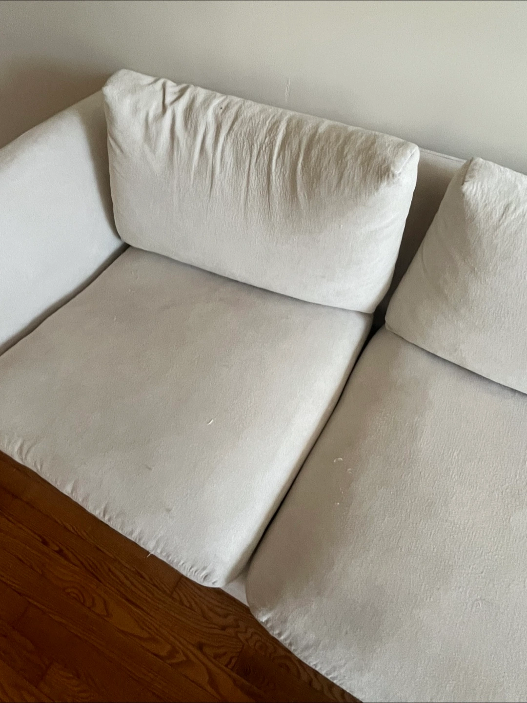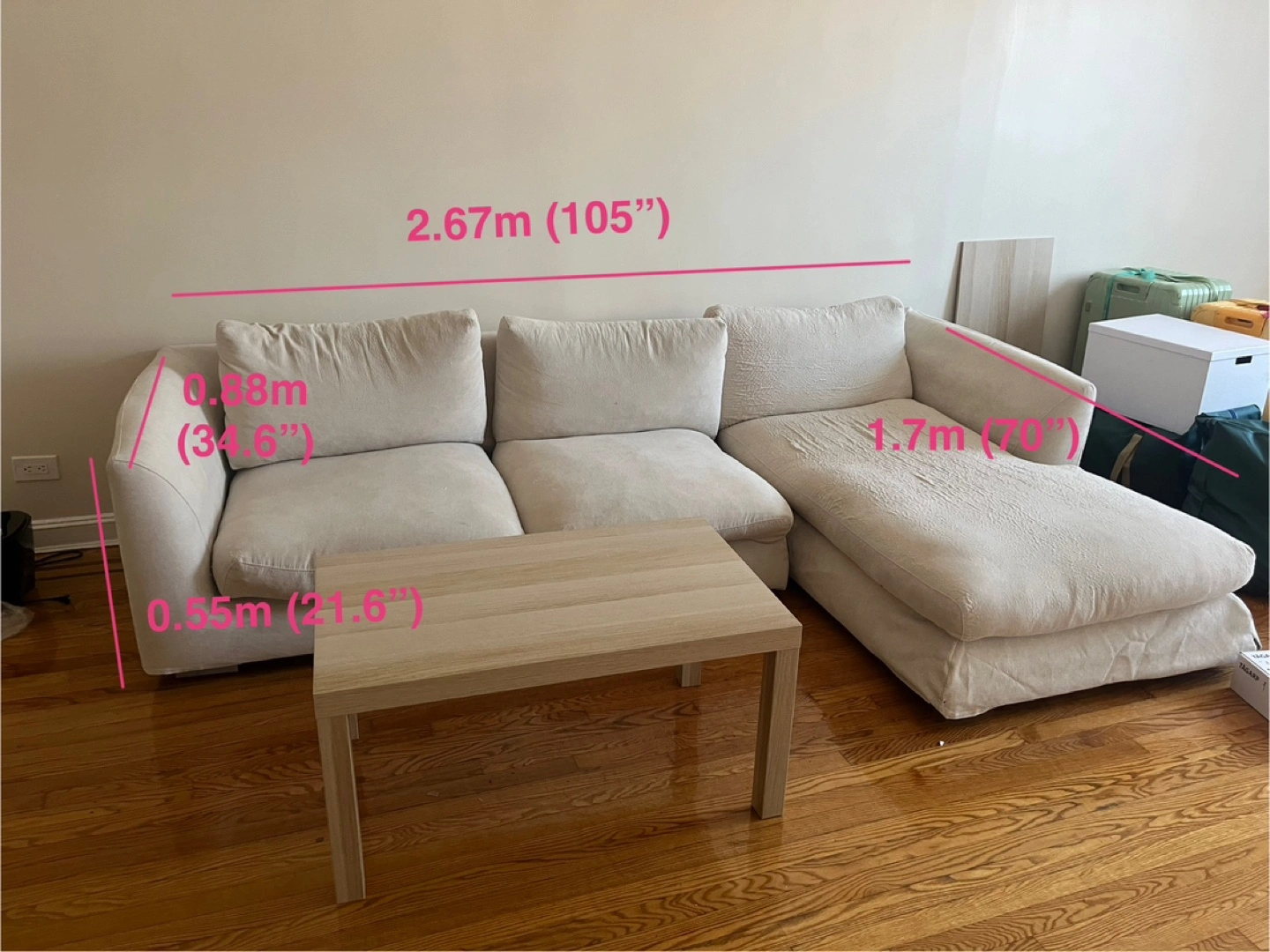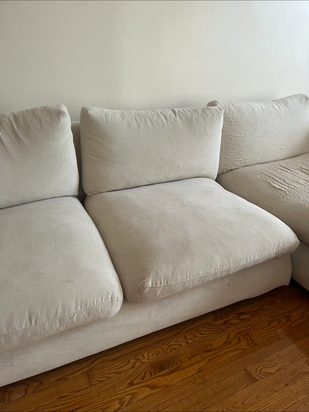 10Selling a comfortable cream-colored cloud modular sectional sofa. It's a great piece for any living room and offers plenty of seating space. The dimensions are approximately 105 inches in length and 70 inches for the chaise lounge section. The seat height is about 21.5 inches. Perfect for lounging and relaxing at home!