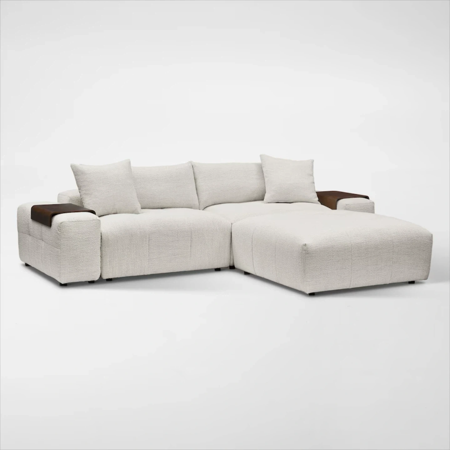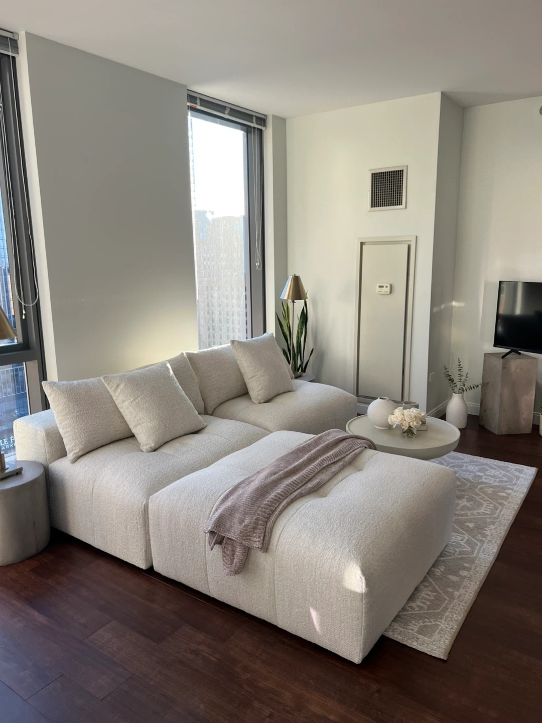 12Selling a comfortable Modular Sectional sofa. It's in great condition and would be perfect for a living room or entertainment area. Nearly brand new and in great condition! 2 armless chairs + ottoman Each arm is 44.5"W x 44.5"D x 33.5"H Total length: 89”