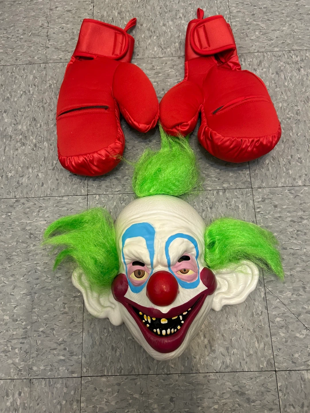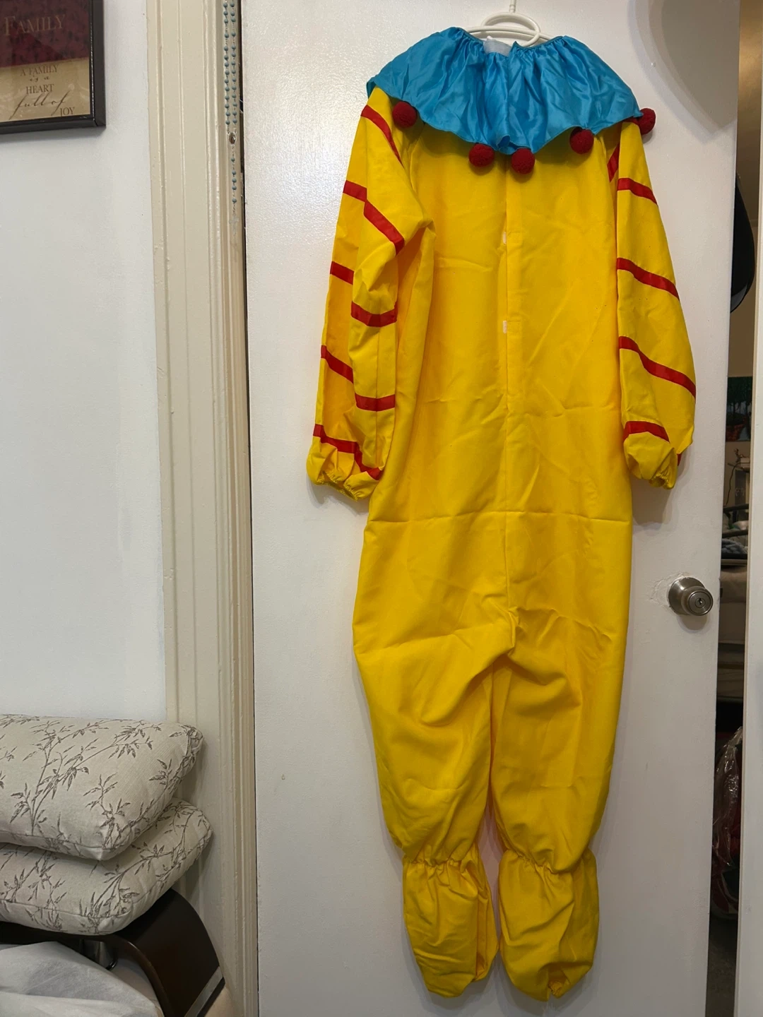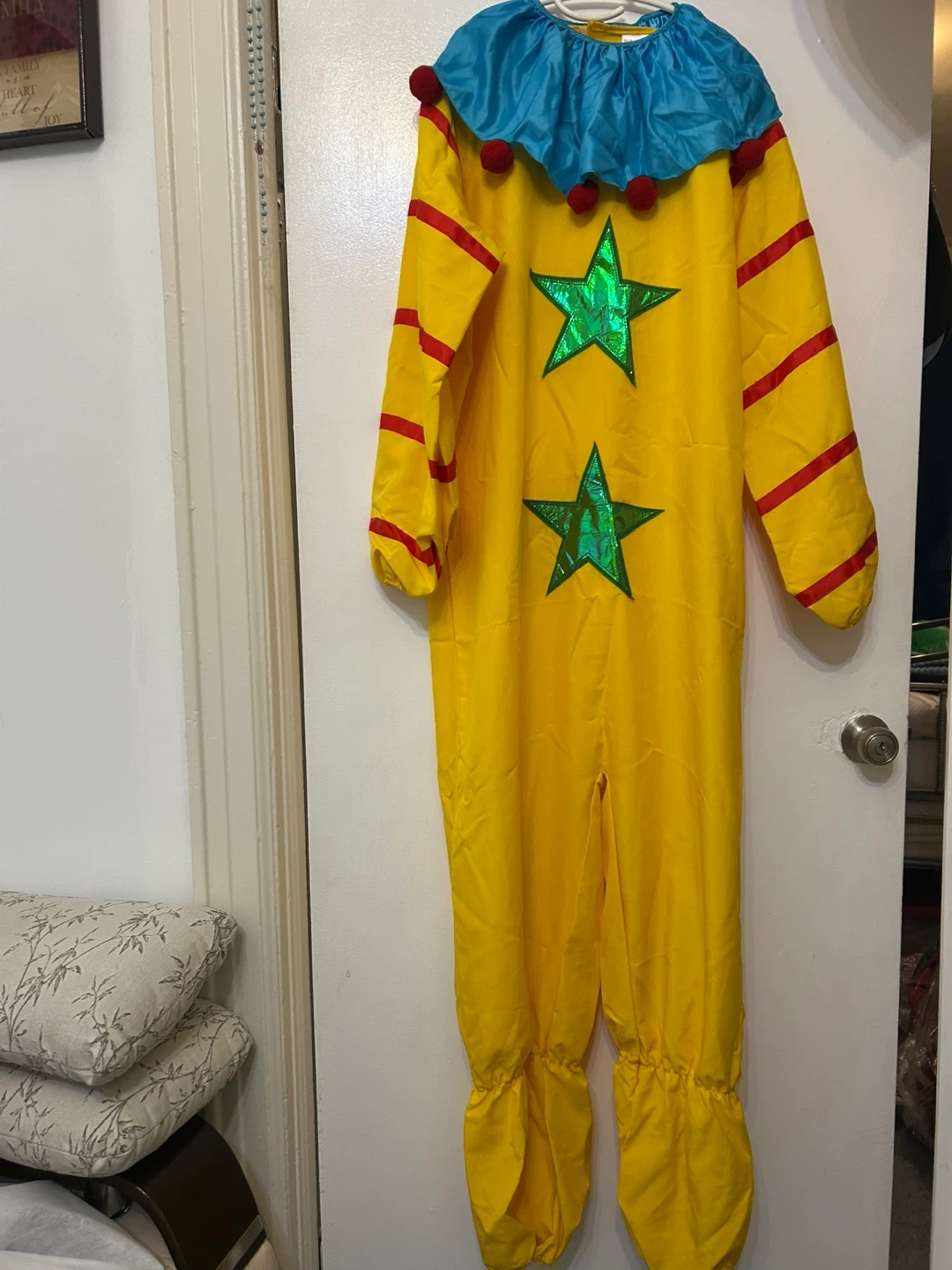 28Selling a clown costume with a yellow jumpsuit, blue collar, red pom poms, and green stars, along with a pair of red boxing gloves and mask