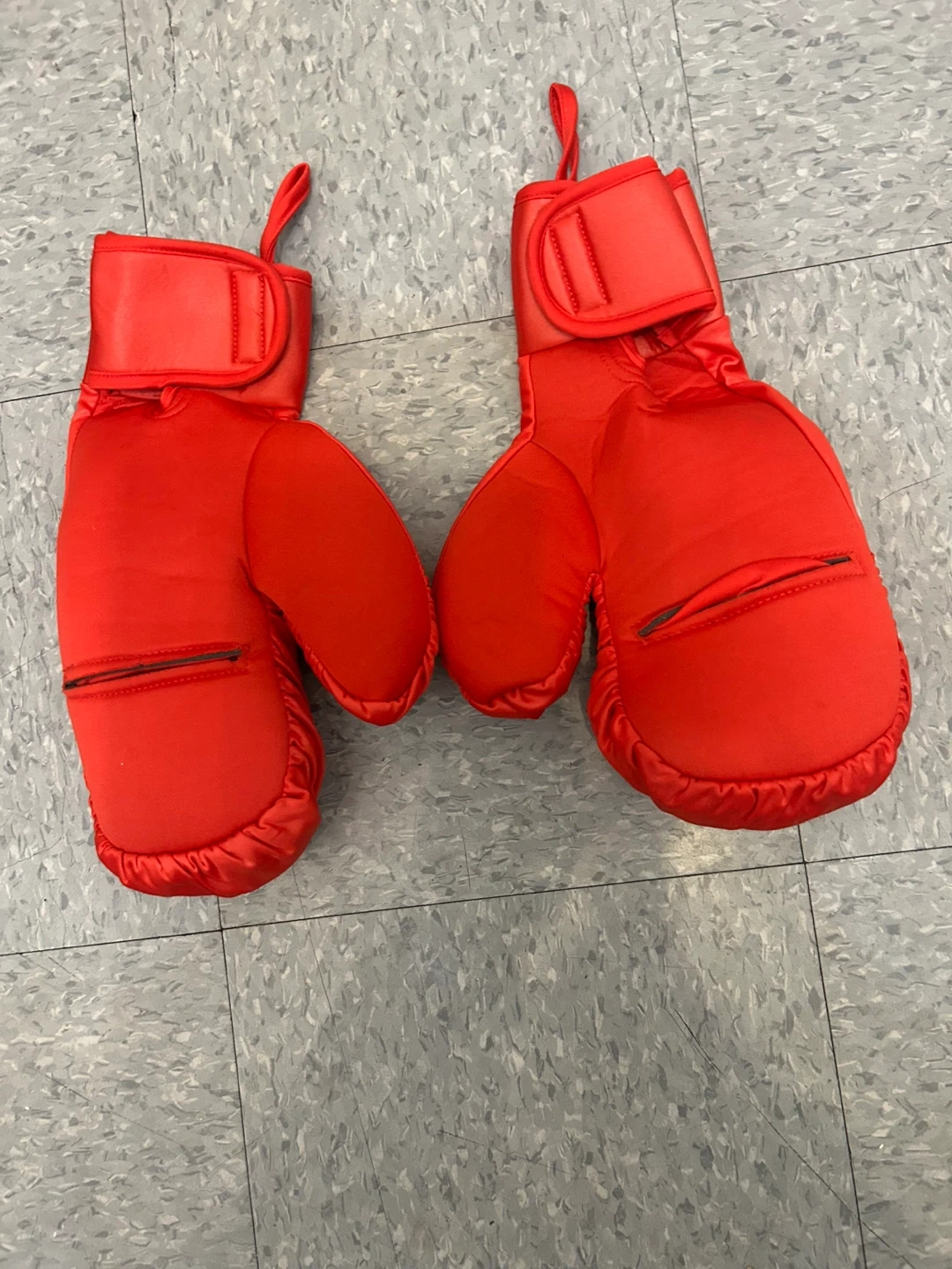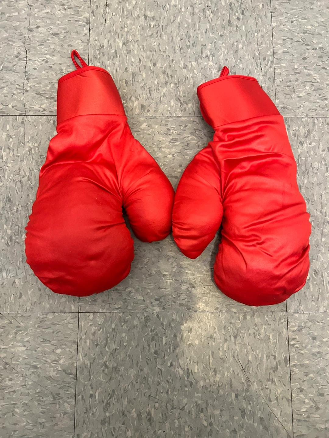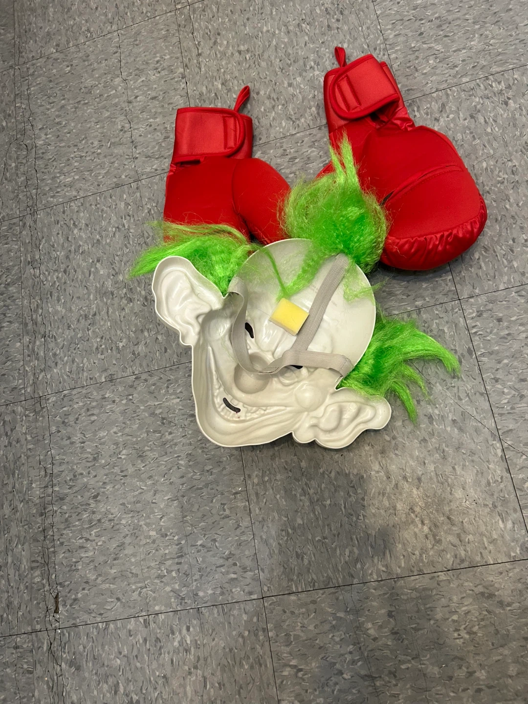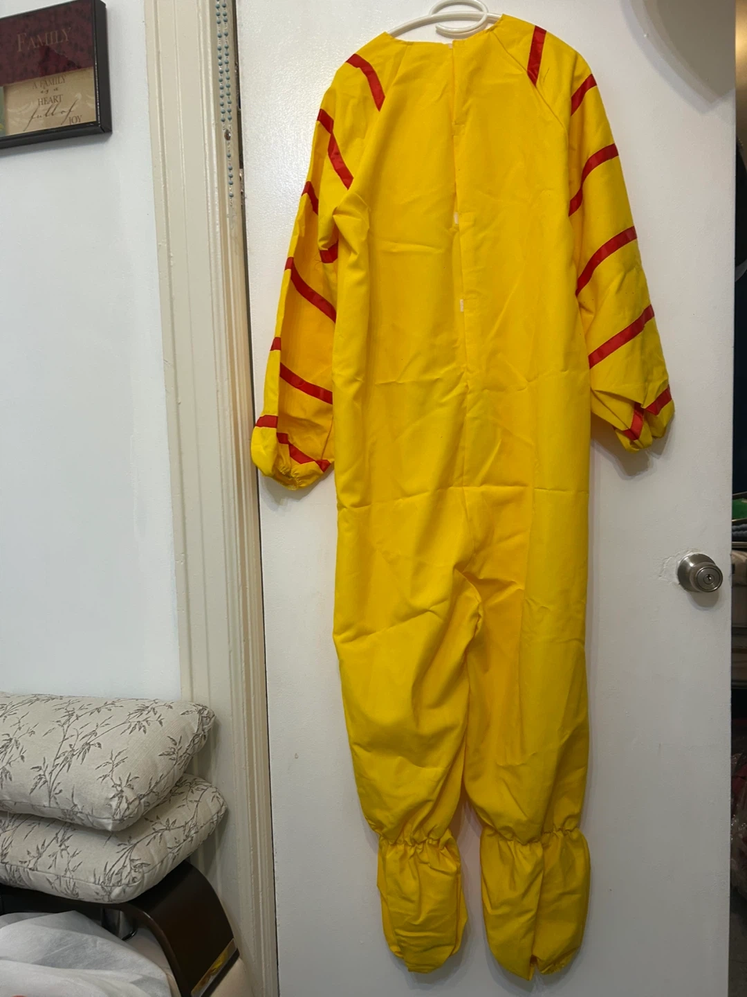 28Selling a clown costume with a yellow jumpsuit, blue collar, red pom poms, and green stars, along with a pair of red boxing gloves and mask