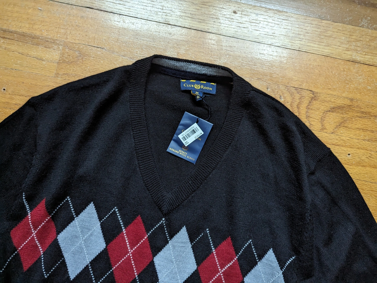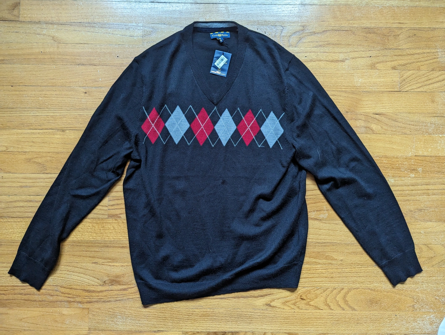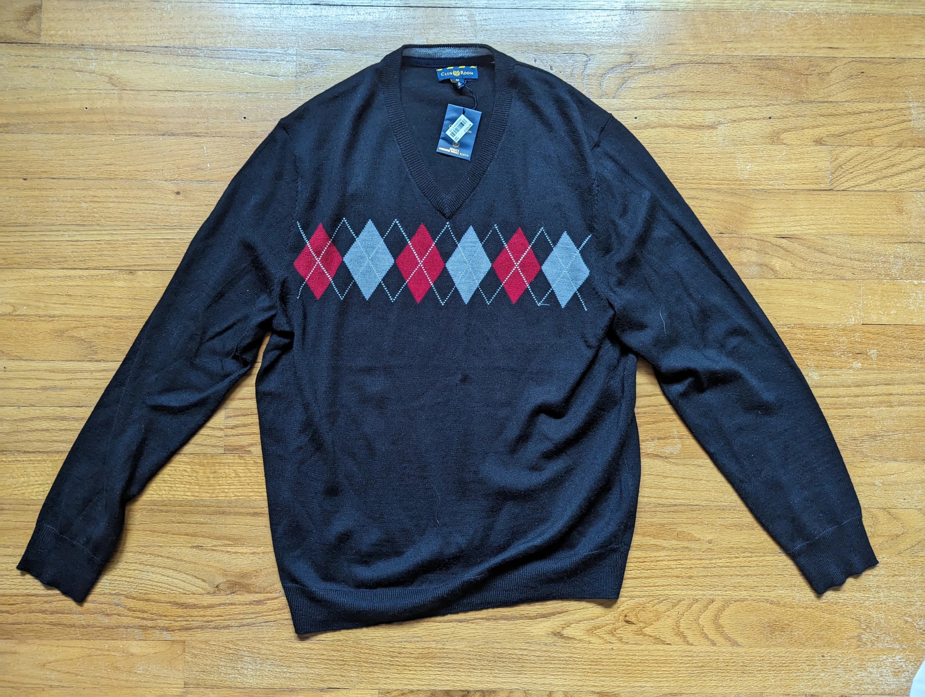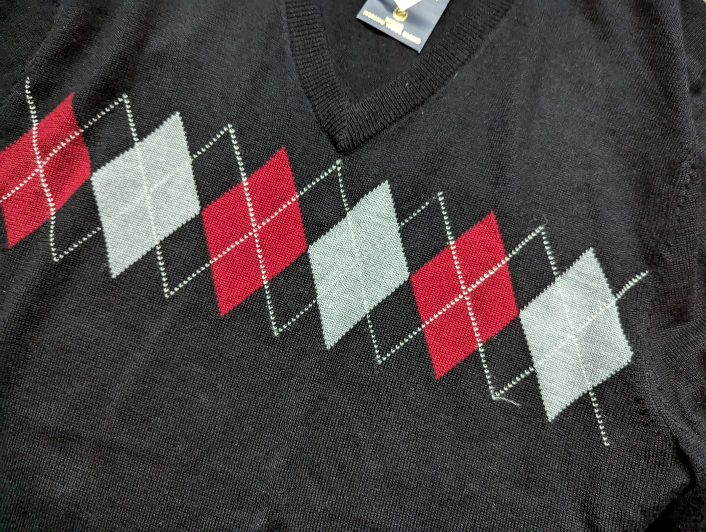 Club Room black argyle V-neck sweater; Merino Wool Blend, Mens M