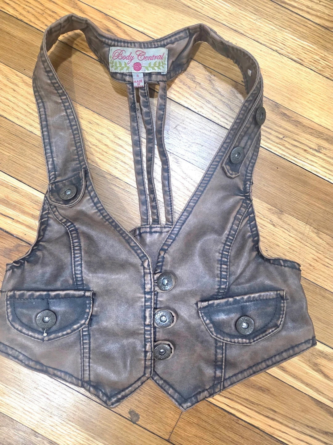 This is a brown button-up vest from Body Central. It's a size S. It features two front pockets with button closures.