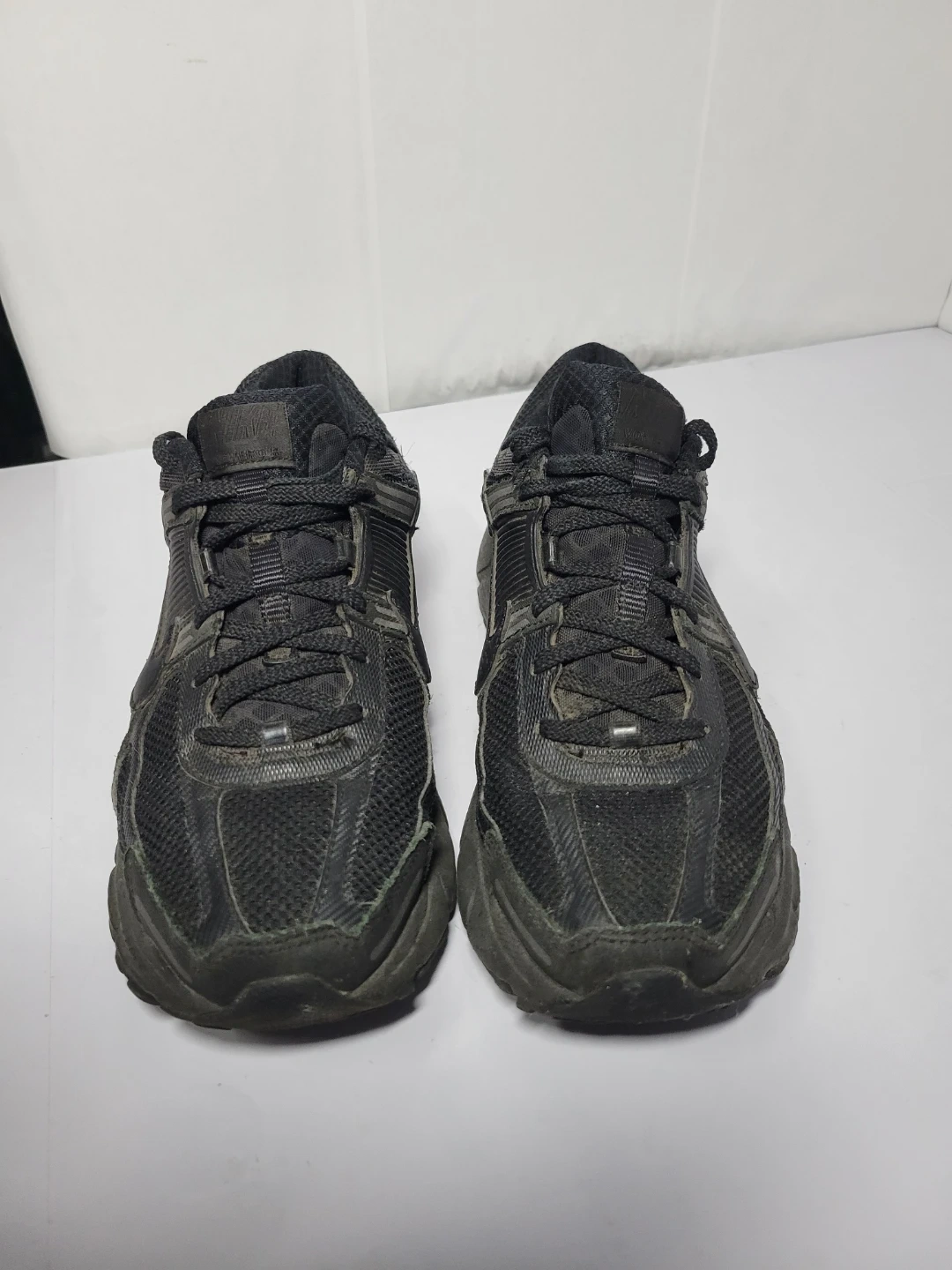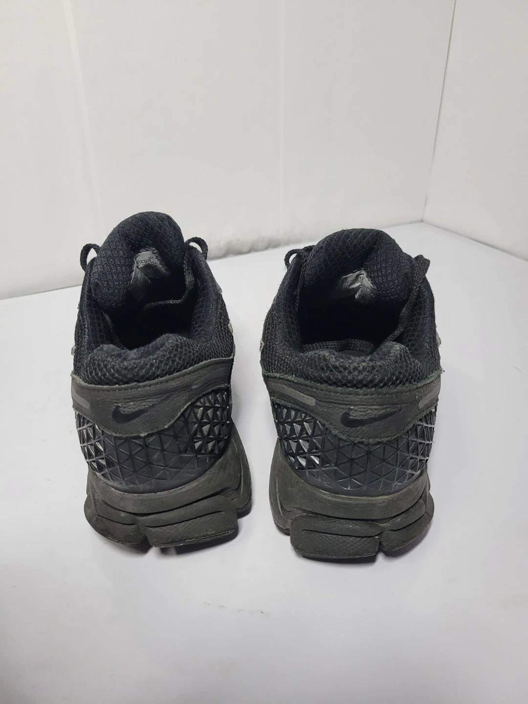 Pair of black Nike running shoes. Mesh upper and rubber sole. These shoes are pre-owned.