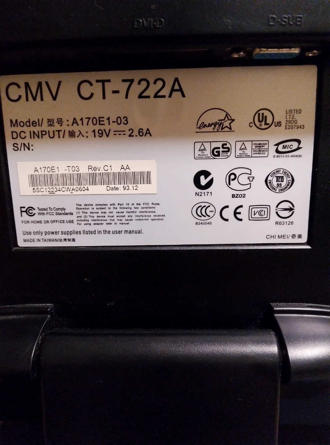 92Selling a CMV CT-722A LCD monitor. It's in good working condition and ready for a new home. Perfect for a home office or as a secondary display! Pick up only