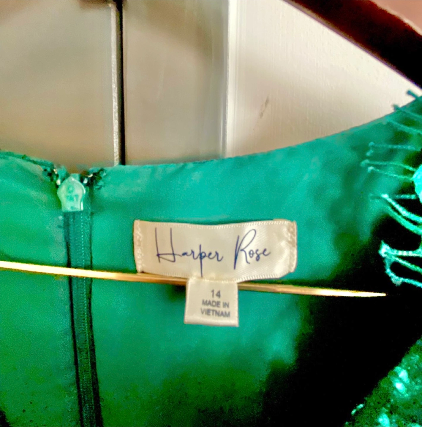 Beautiful Harper Rose lace dress in a lovely green color! It's a size 14 and made with a shell of 35% cotton, 35% nylon, and 30% rayon. The lining is 96% polyester and 4% spandex. Perfect for a special occasion!