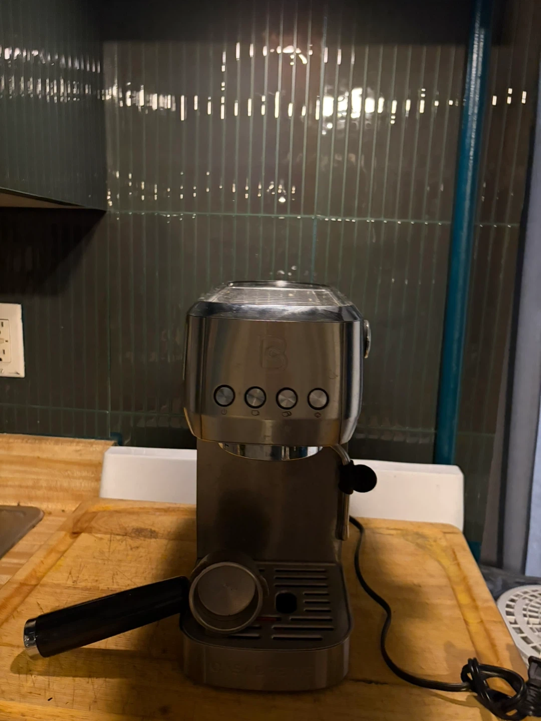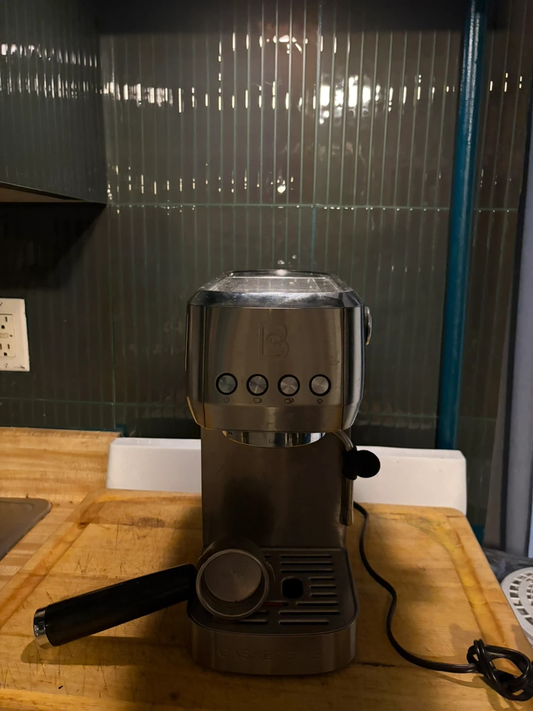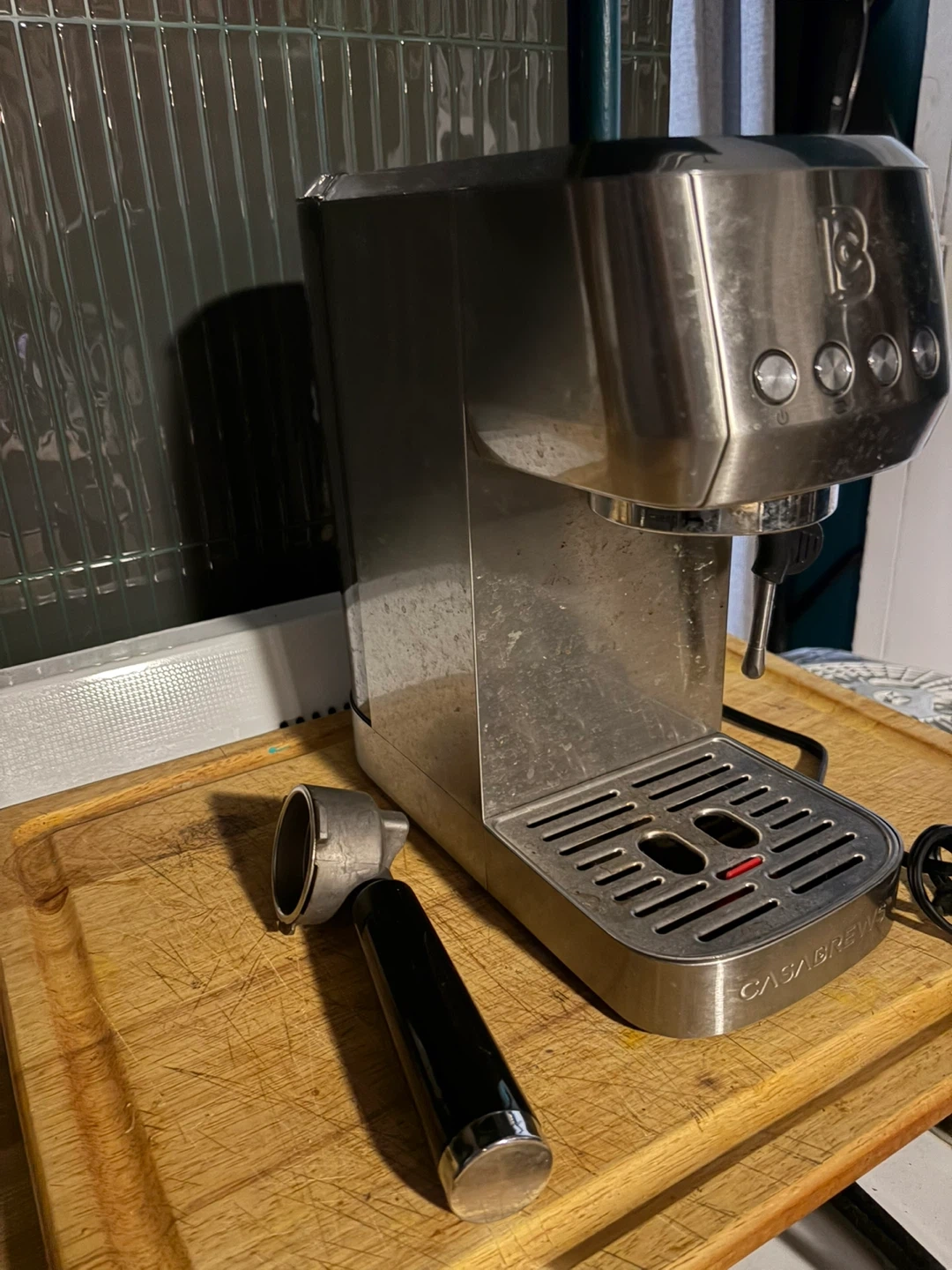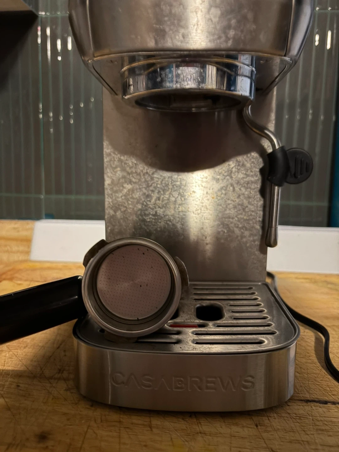 CASABREWS espresso machine with a stainless steel finish. Comes with a portafilter. Great for making lattes and cappuccinos!
