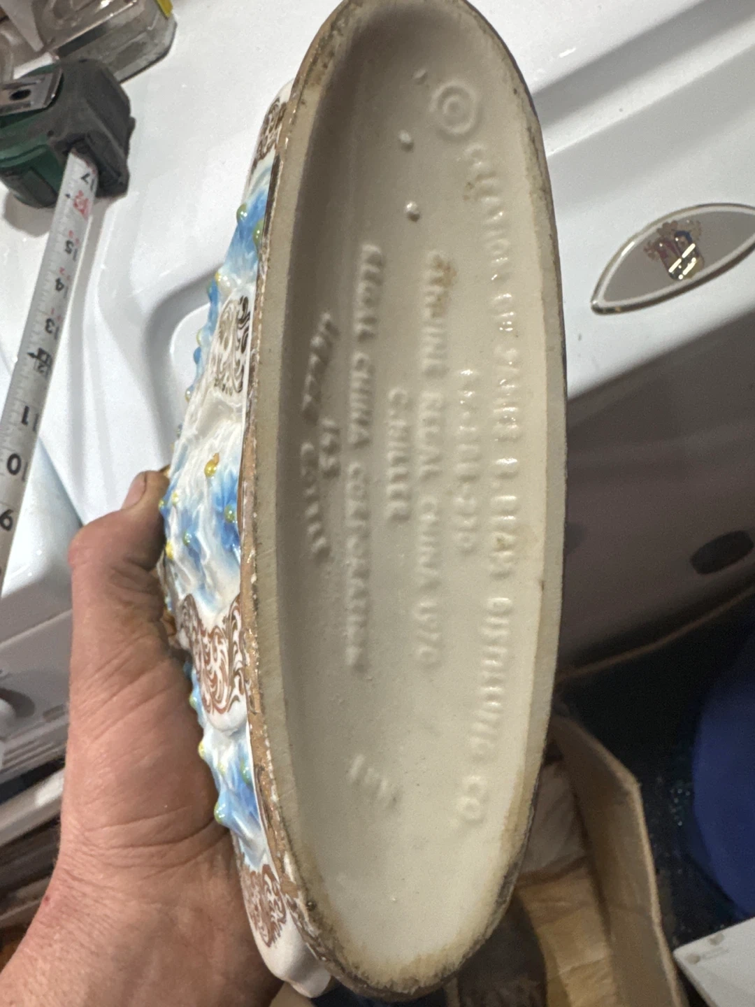 It is made of genuine Regal China and features a blue and white floral design with gold gilt accents.