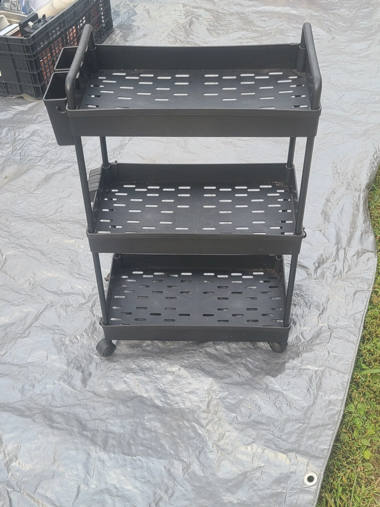 This is a black 3-tier rolling cart that's perfect for organizing your space! It has a sleek design and is easy to move around thanks to its smooth-rolling wheels. Great for use in the kitchen, bathroom, office, or anywhere you need extra storage