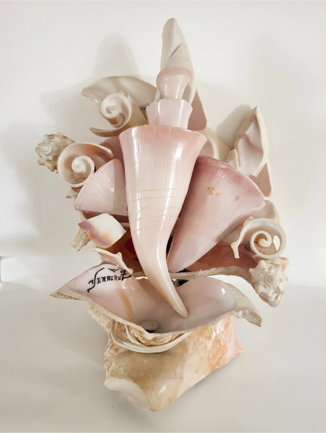 Unique vintage seashell lamp! It's a beautiful piece of art made entirely of seashells in various shapes and sizes. The sculpture features a mix of natural and light pink hues. It's in great condition and ready to add a touch of coastal charm to your home