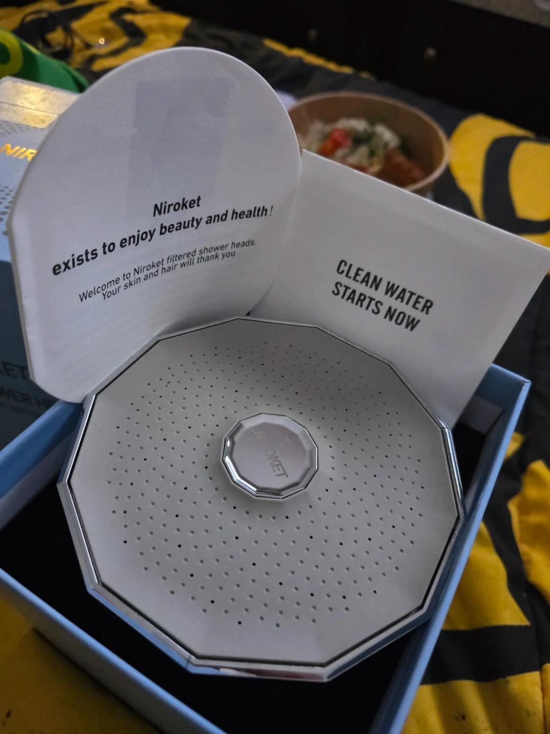 This Niroket filter shower head promotes health and beauty with clean water. It's designed to enhance your shower experience. Includes original box and packaging.