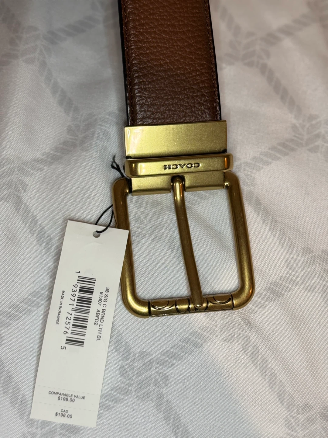 5Selling a brand new leather Coach belt in size 42. It's reversible, featuring brown leather on one side and black on the other. The buckle has the Coach logo on it. The comparable value on the tag is $198