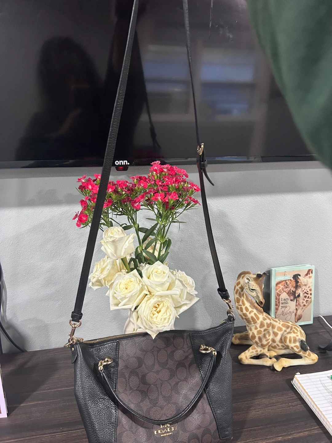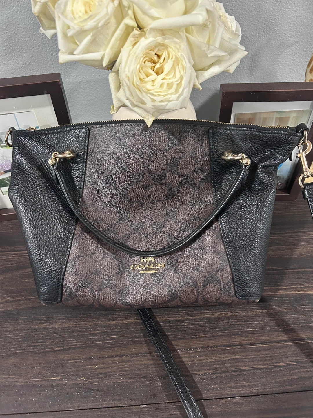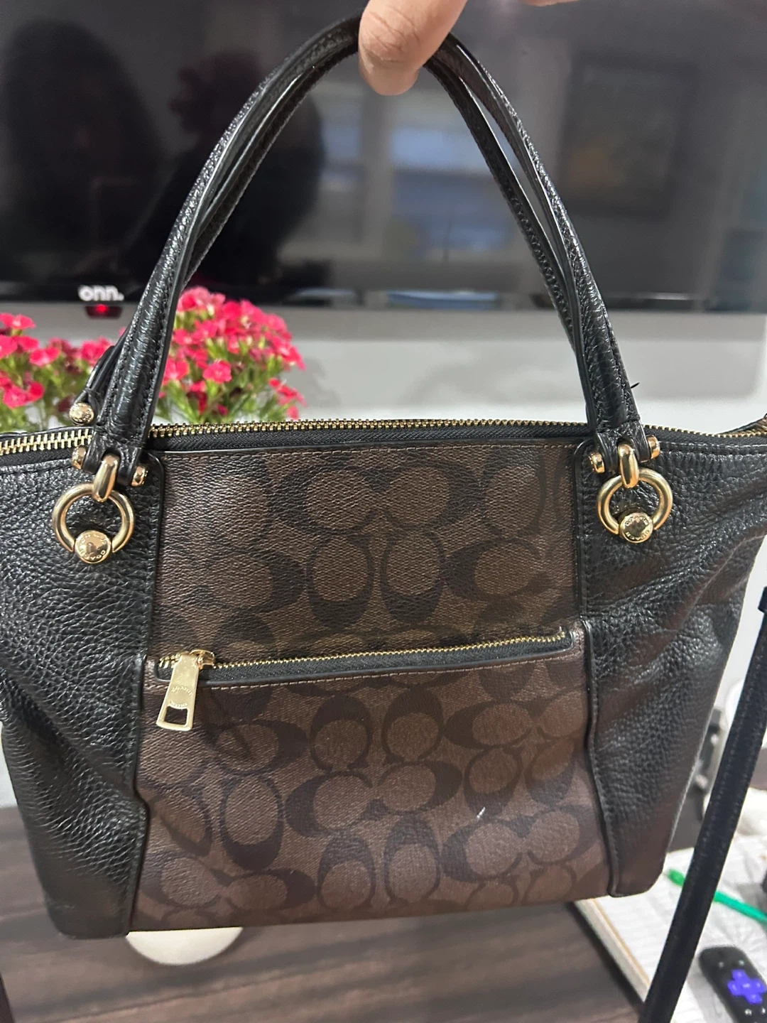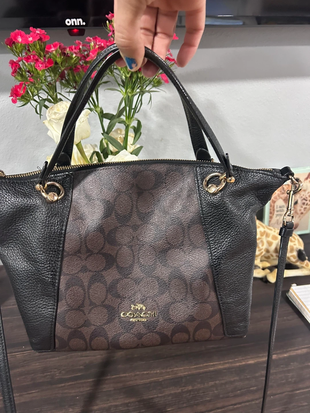 60Selling a Coach handbag in good condition! It's a stylish mix of black and brown leather with the Coach logo pattern. Perfect for everyday use or a night out