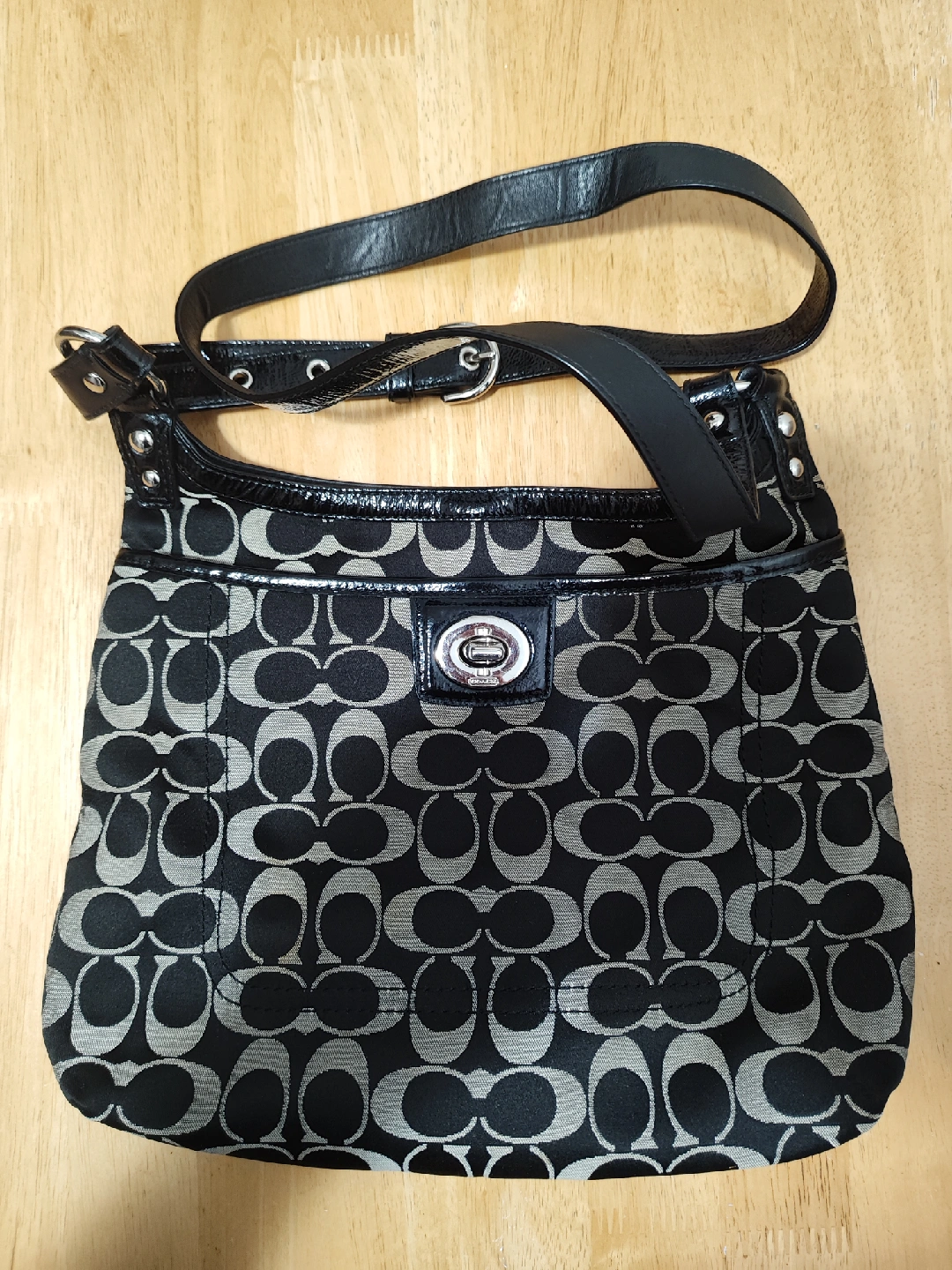 This is a Coach shoulder bag in black and gray with the signature 'C' pattern. It has a black leather strap and silver hardware. It's in great condition and ready for a new home