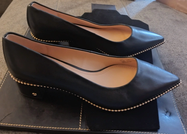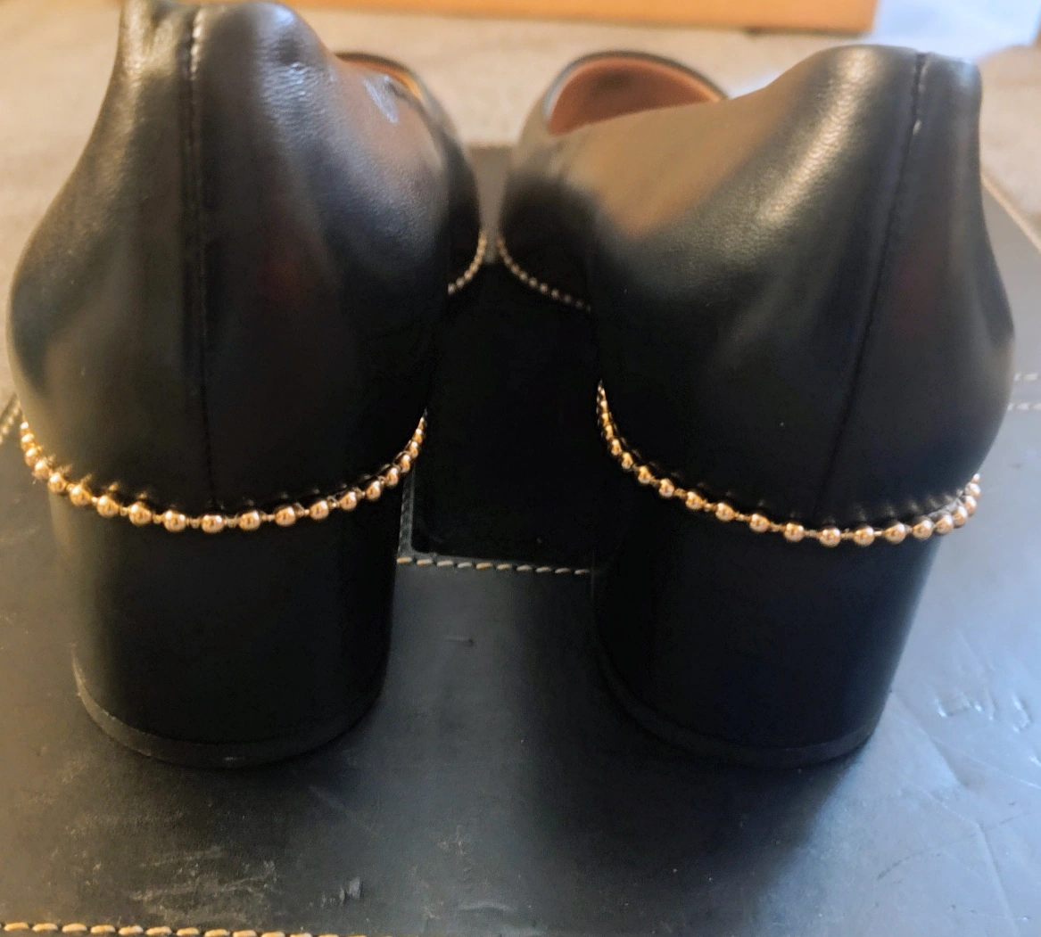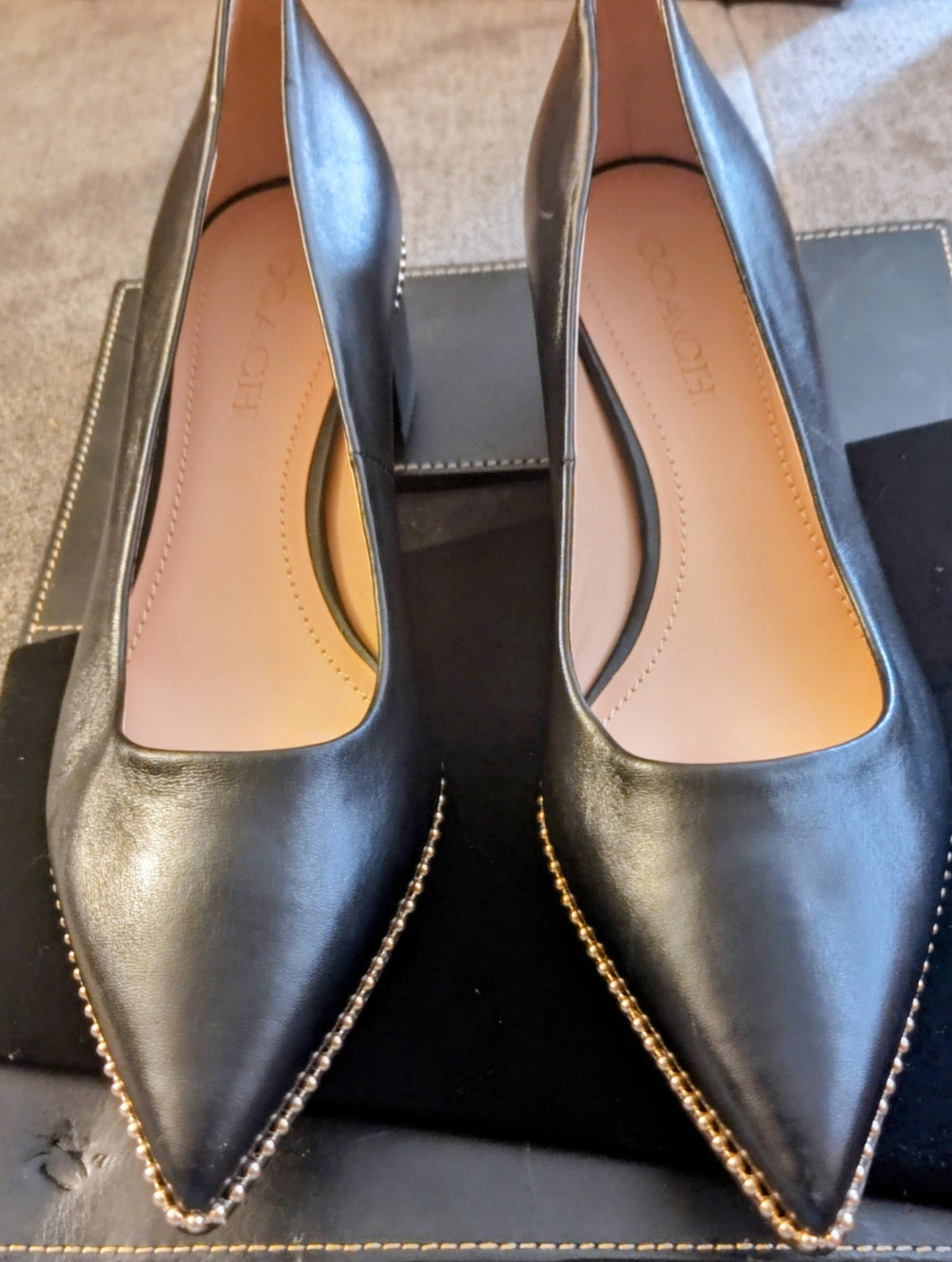 Selling a pair of Coach black leather heels in size 7.5 These stylish heels feature a sleek design with gold-tone bead accents. Perfect for adding a touch of elegance to any outfit!