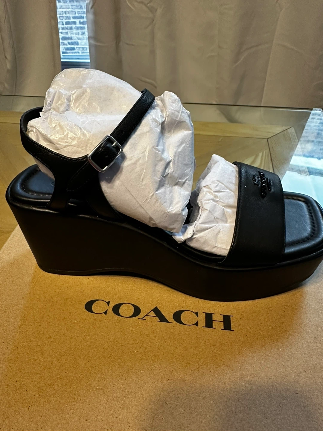 Selling a pair of Coach platform wedge sandals in black leather. They come with the original box. These sandals are perfect for adding a bit of height and style to any outfit!