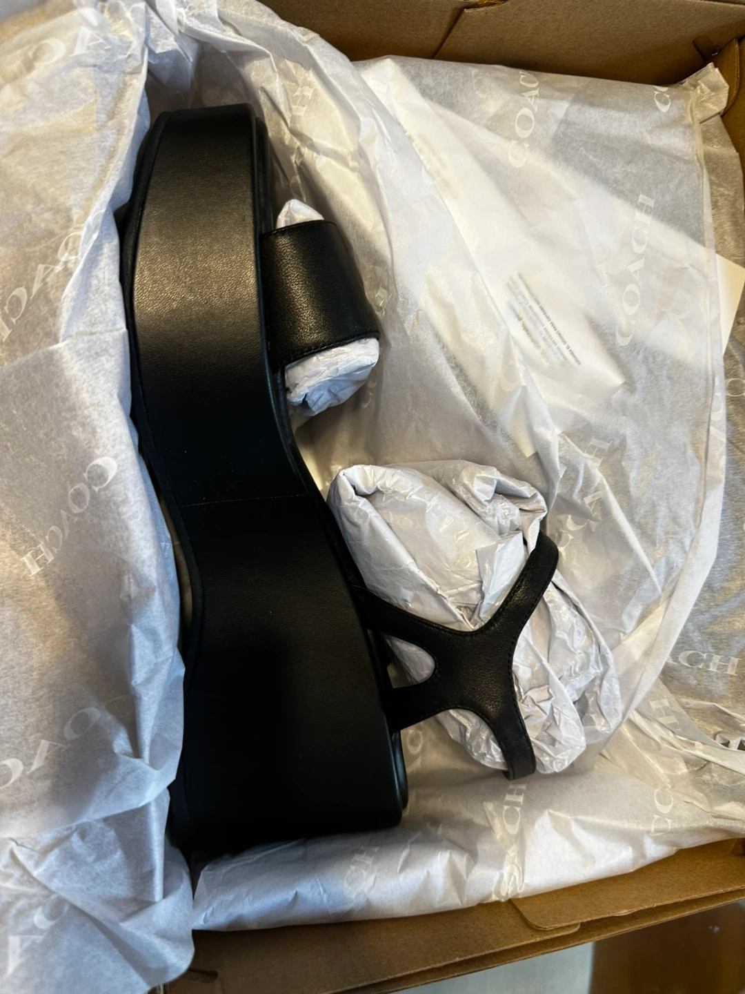 Selling a pair of Coach platform wedge sandals in black leather. They come with the original box. These sandals are perfect for adding a bit of height and style to any outfit!