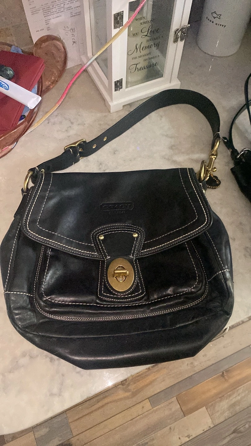 Black leather shoulder bag with gold hardware. Has a flap closure and multiple pockets. Comes with a strap that can be adjusted to fit comfortably on your shoulder.