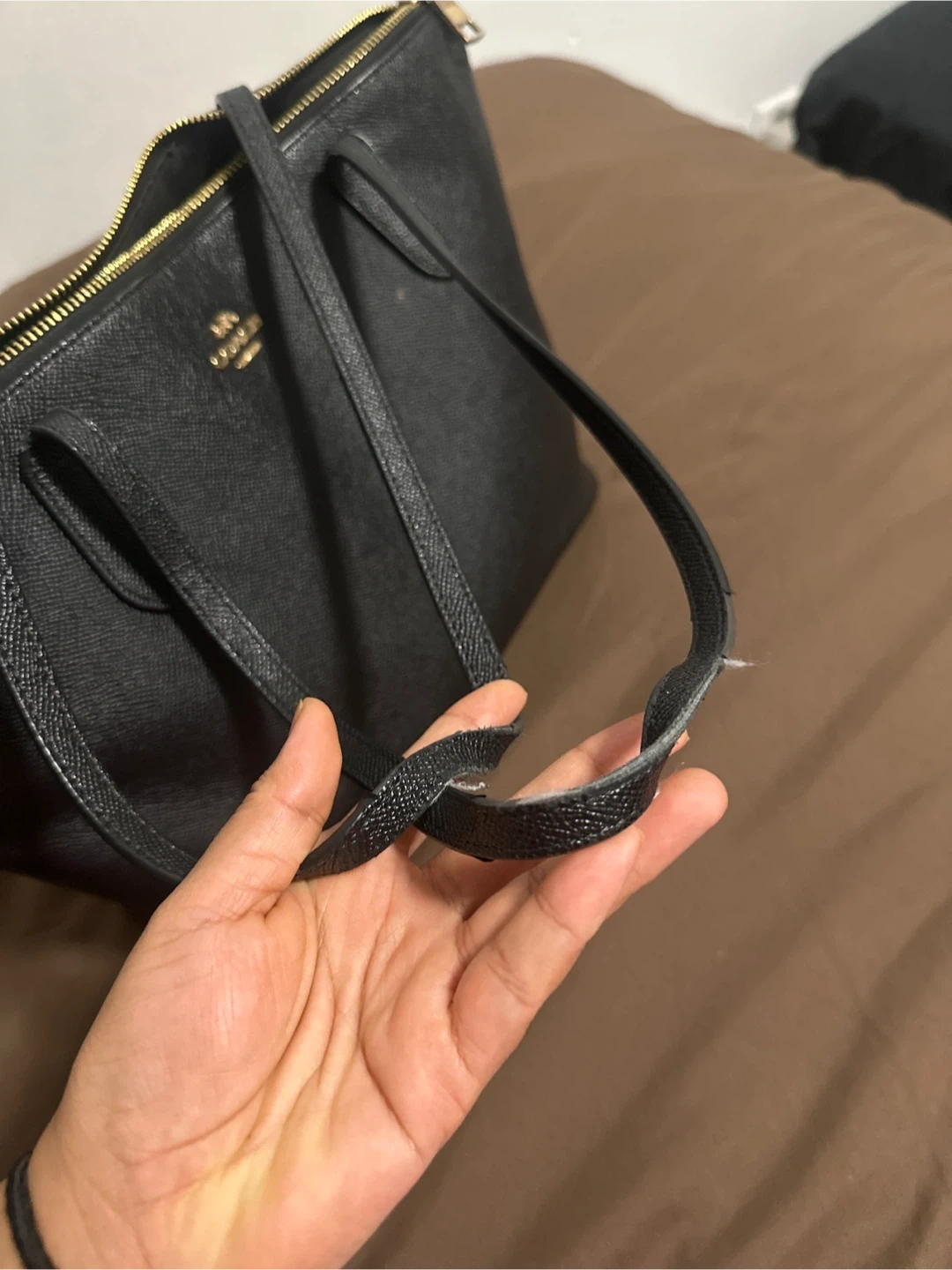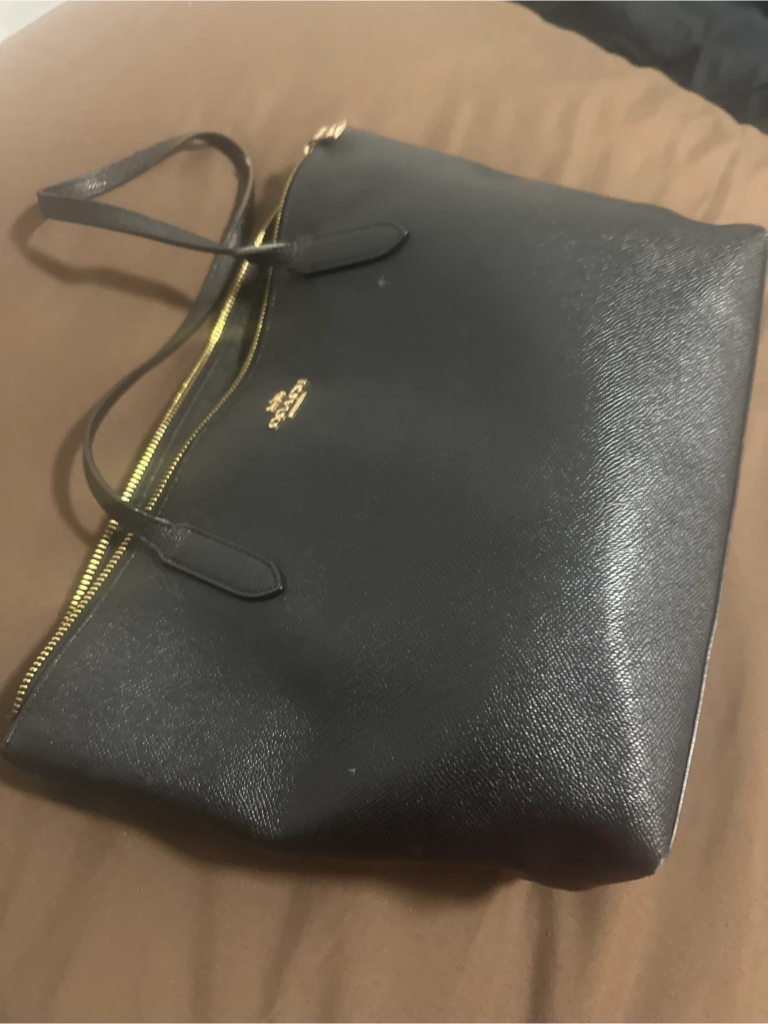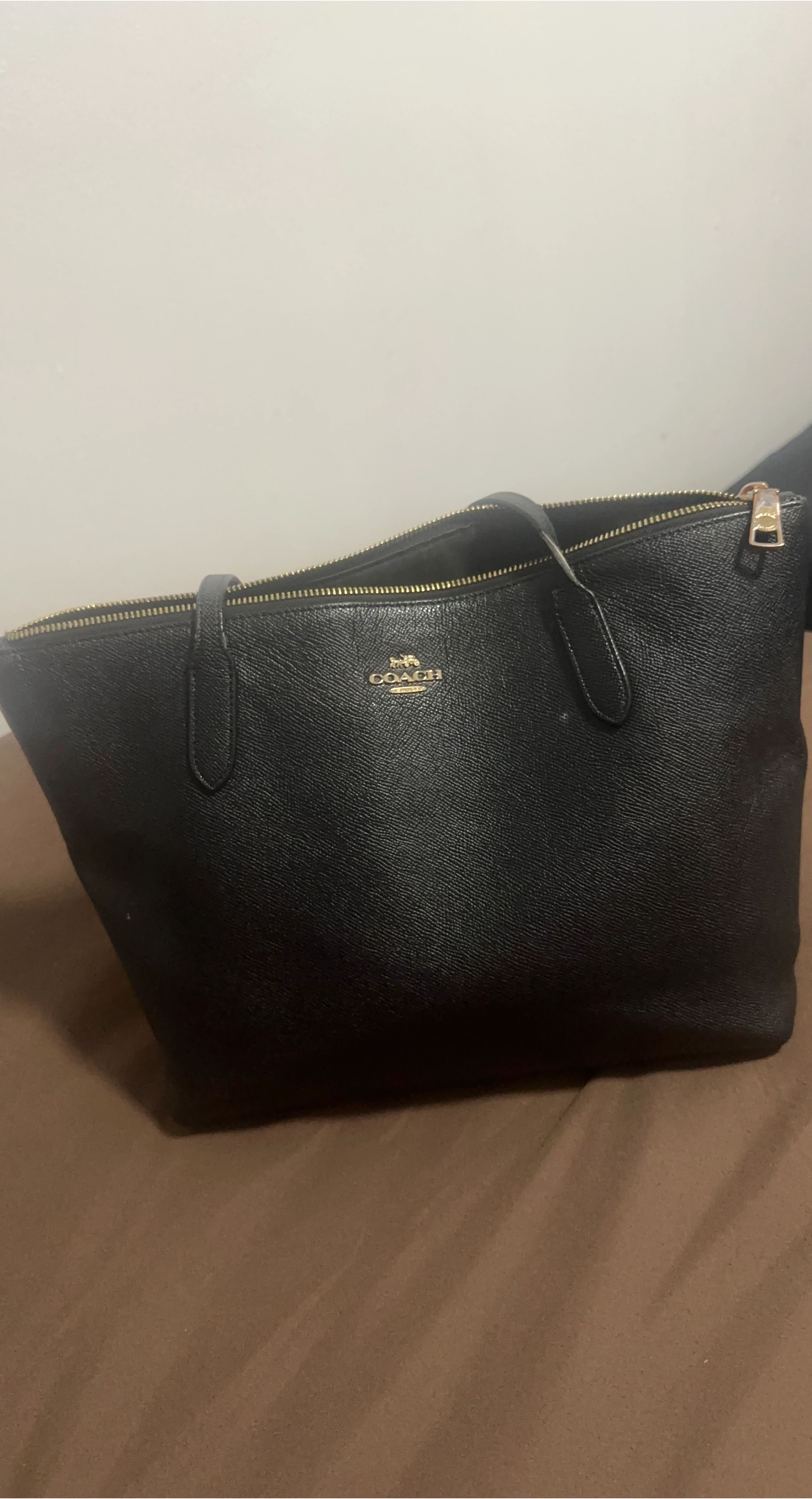 15Selling a black leather tote bag from Coach! It's a stylish and functional bag, perfect for everyday use. There are some signs of wear on the handles, as shown in the pictures, but overall it's in good condition and ready for a new home