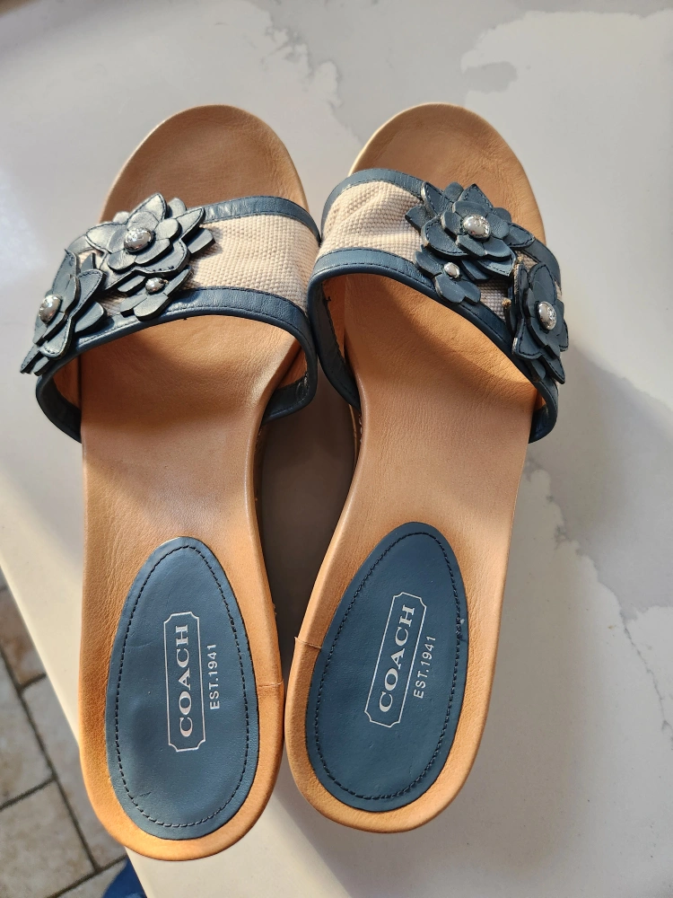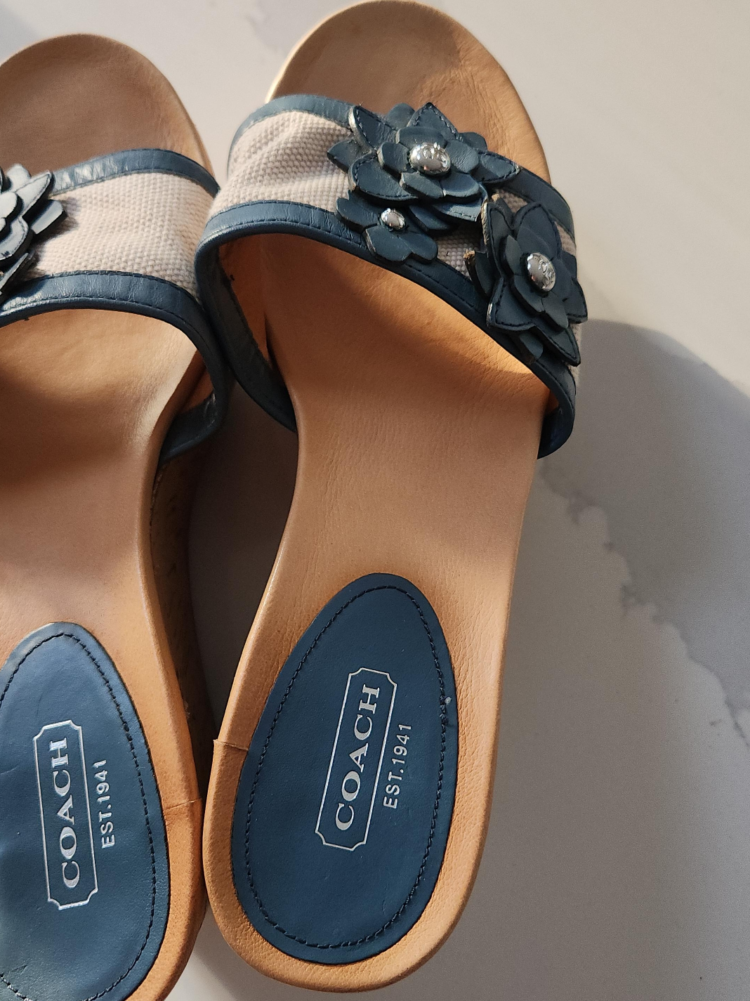 Cute Coach sandals with a floral design! These are a size 9 and feature a blue and beige color scheme. Perfect for adding a touch of style to your summer wardrobe