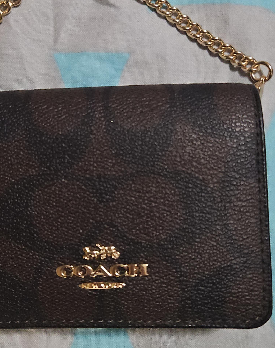 Selling a cute Coach chain wallet in brown and black! It features the classic Coach logo pattern and a stylish gold chain. Perfect for carrying your essentials in style Grand you never use purchased November 2024 MSRP $985