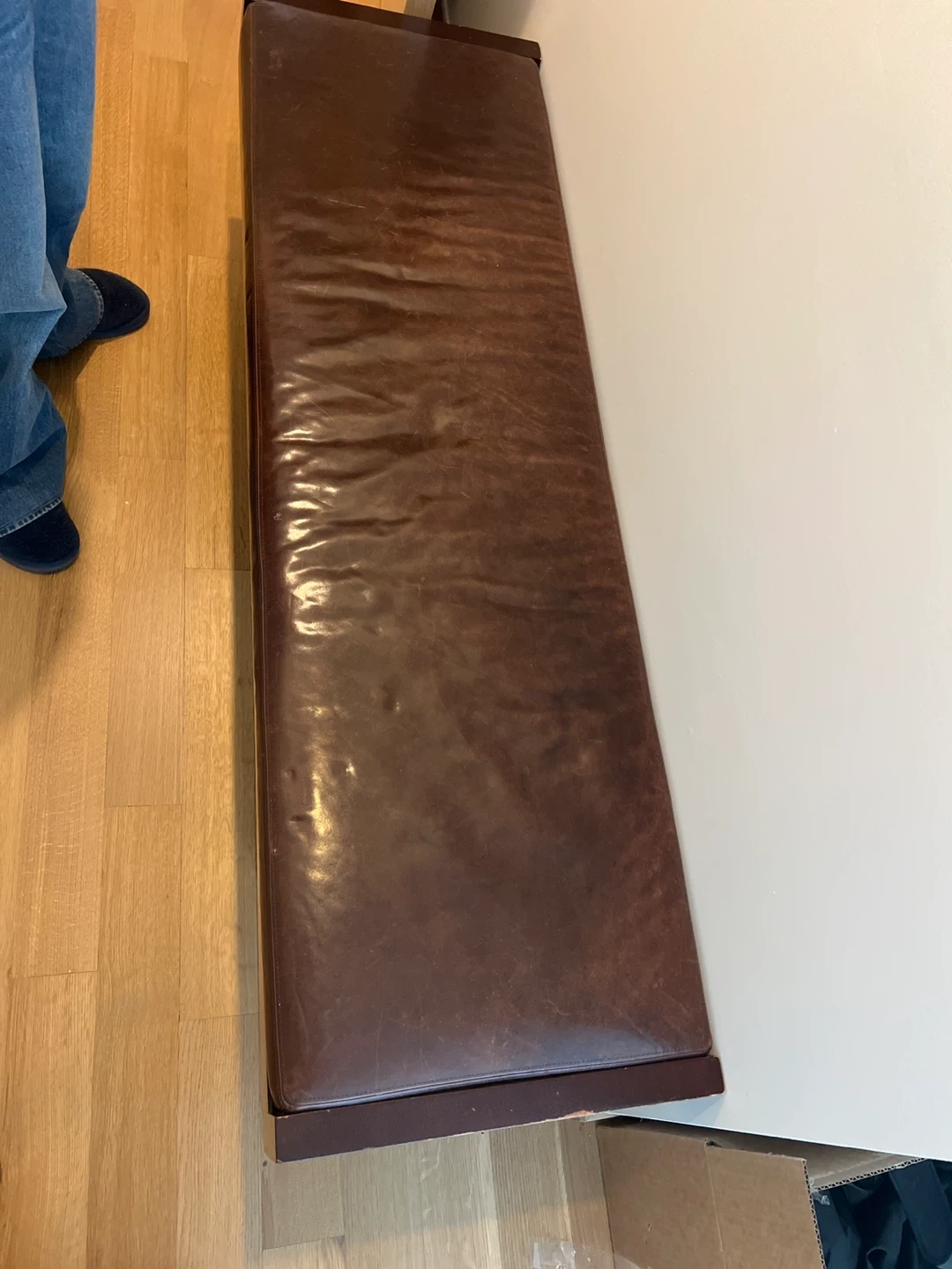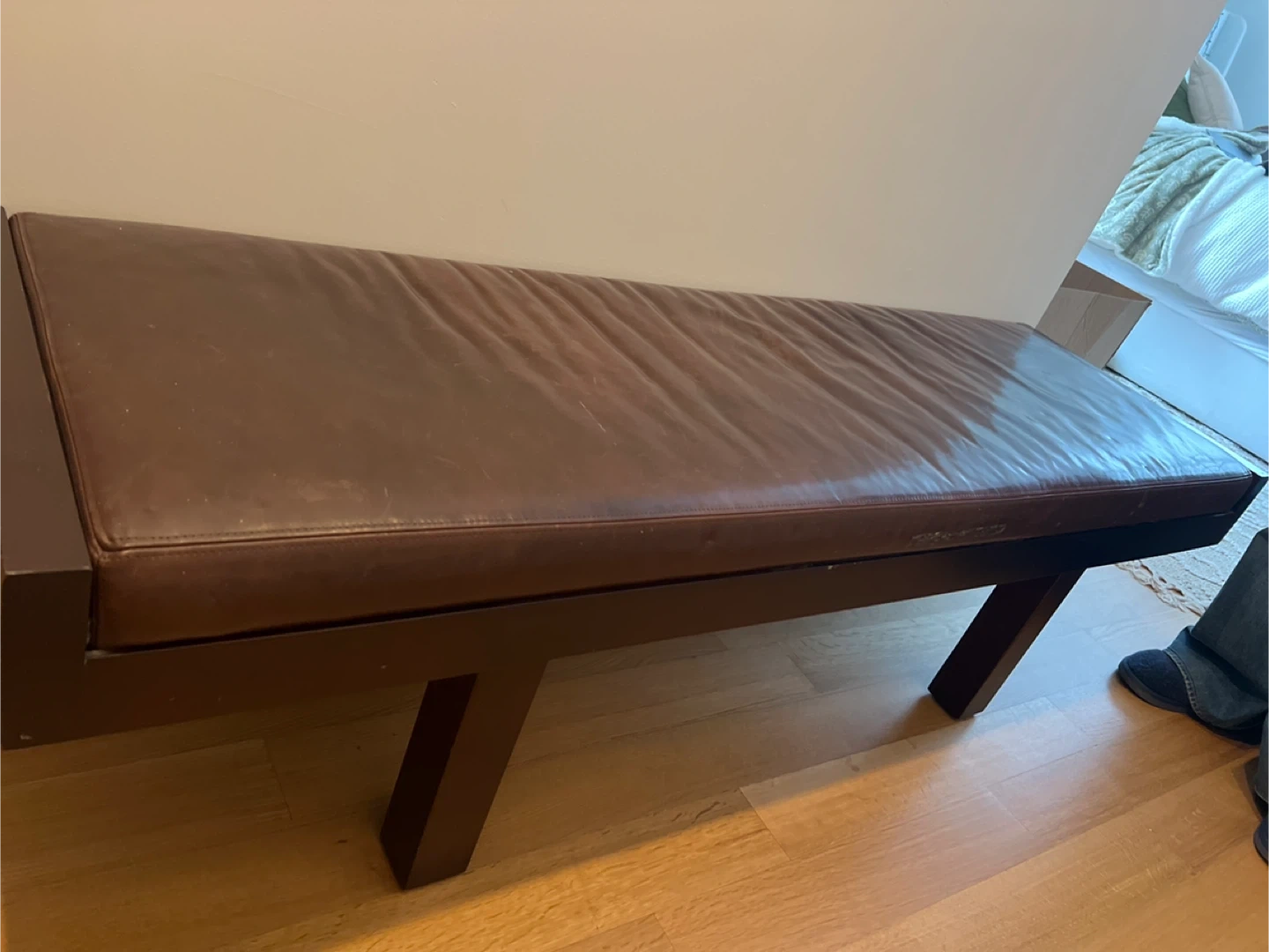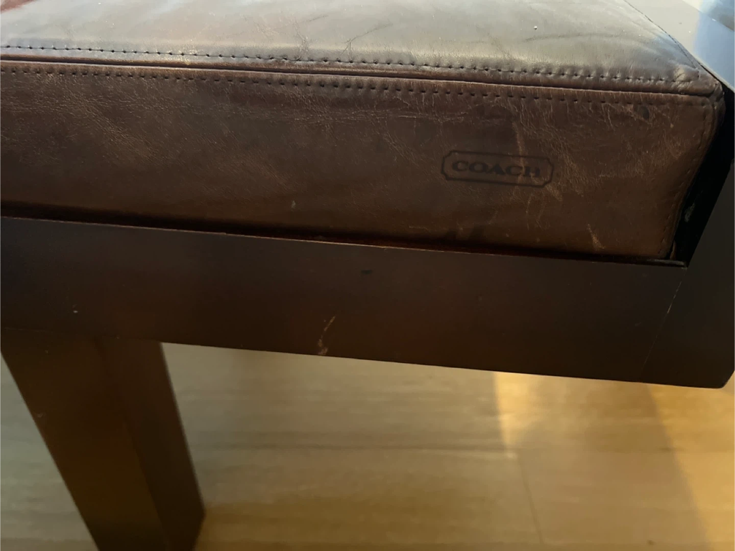 Selling a brown leather bench from Coach. It has a dark brown wooden frame and a padded leather seat. There are some signs of wear on the leather, but it's still a stylish and functional piece!