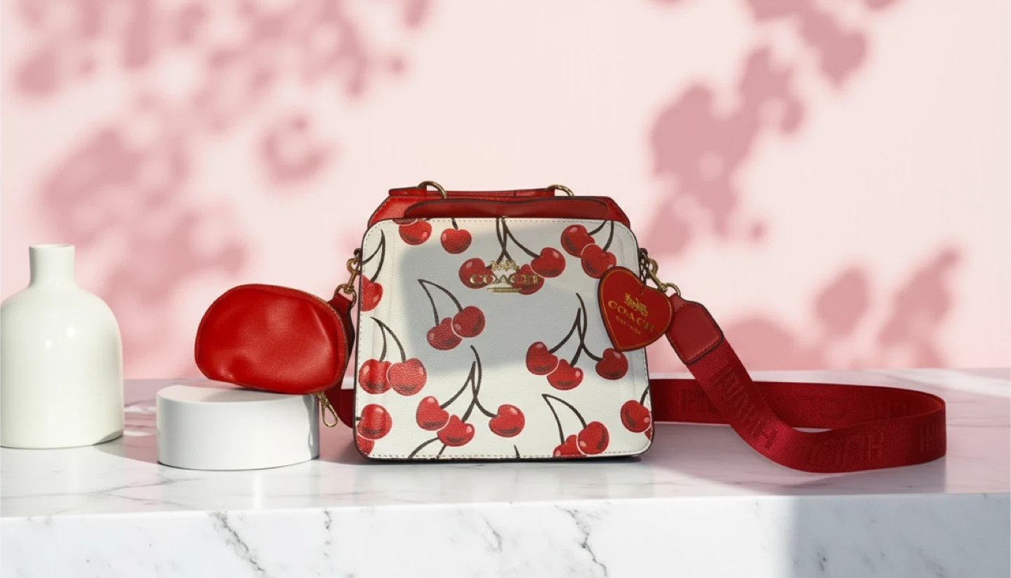 60This is a Coach Kat Saddle Bag with a cherry print. It comes with a detachable coin pouch and a red strap. The bag has a heart-shaped Coach tag.