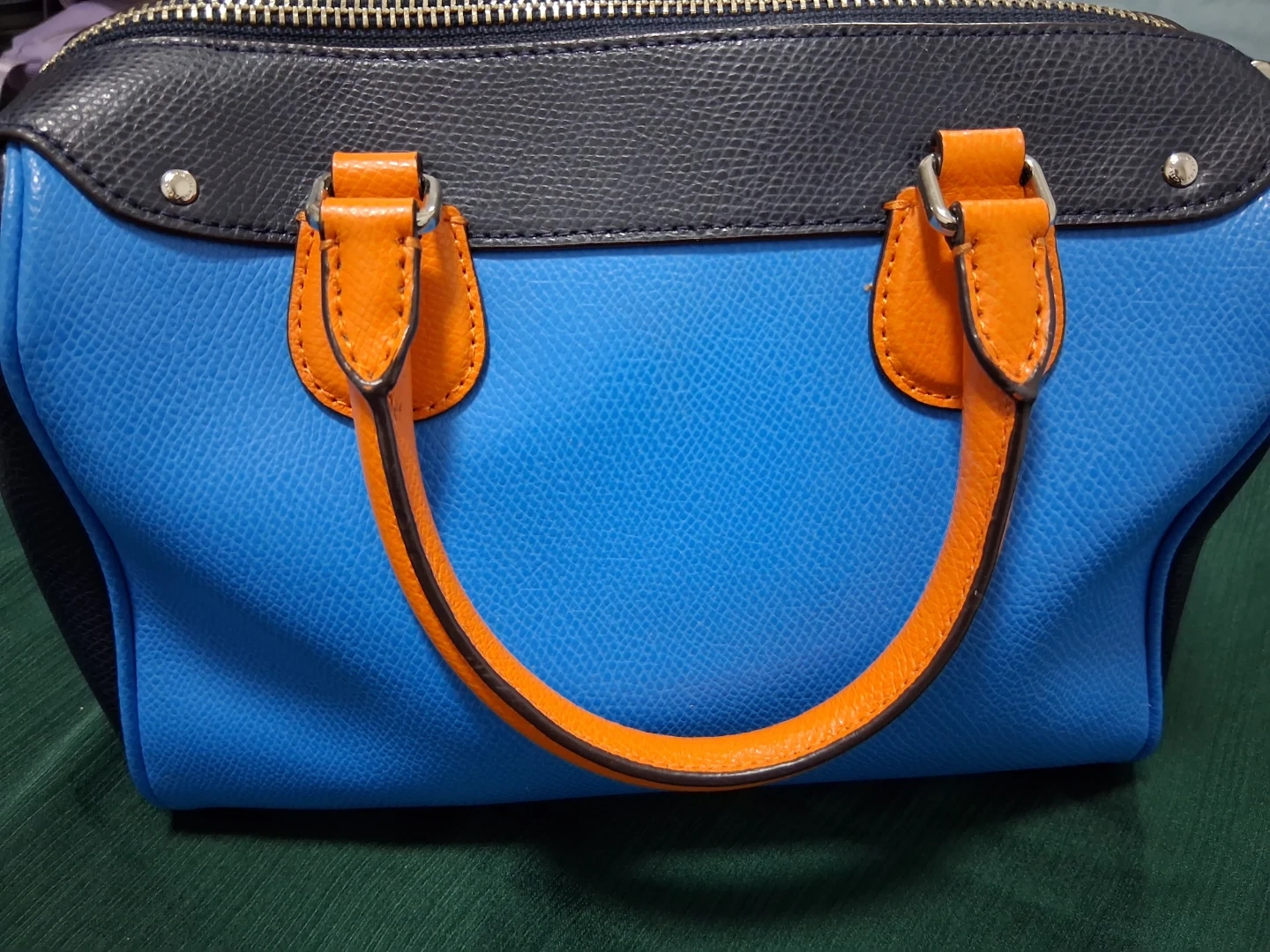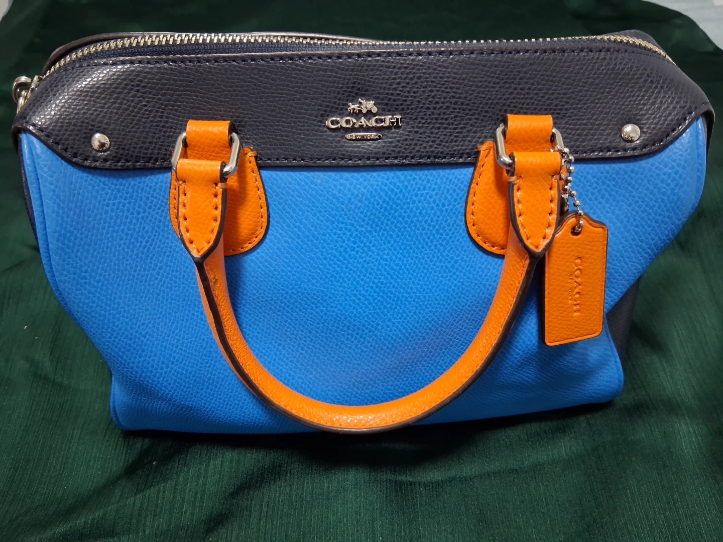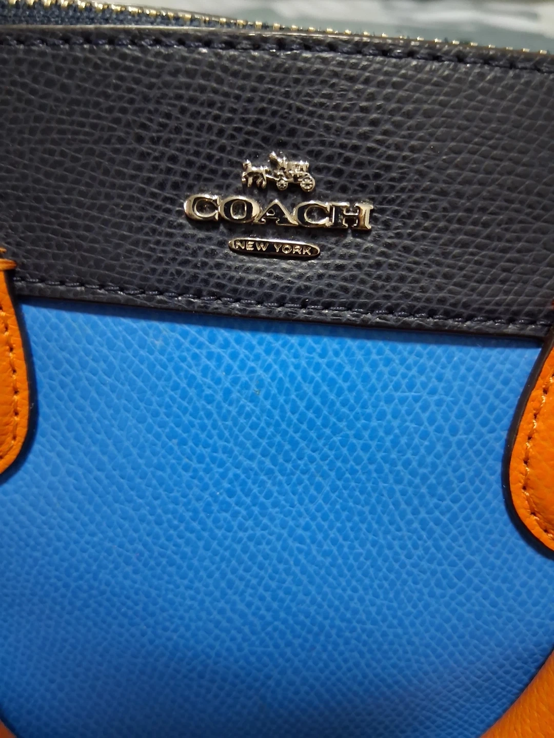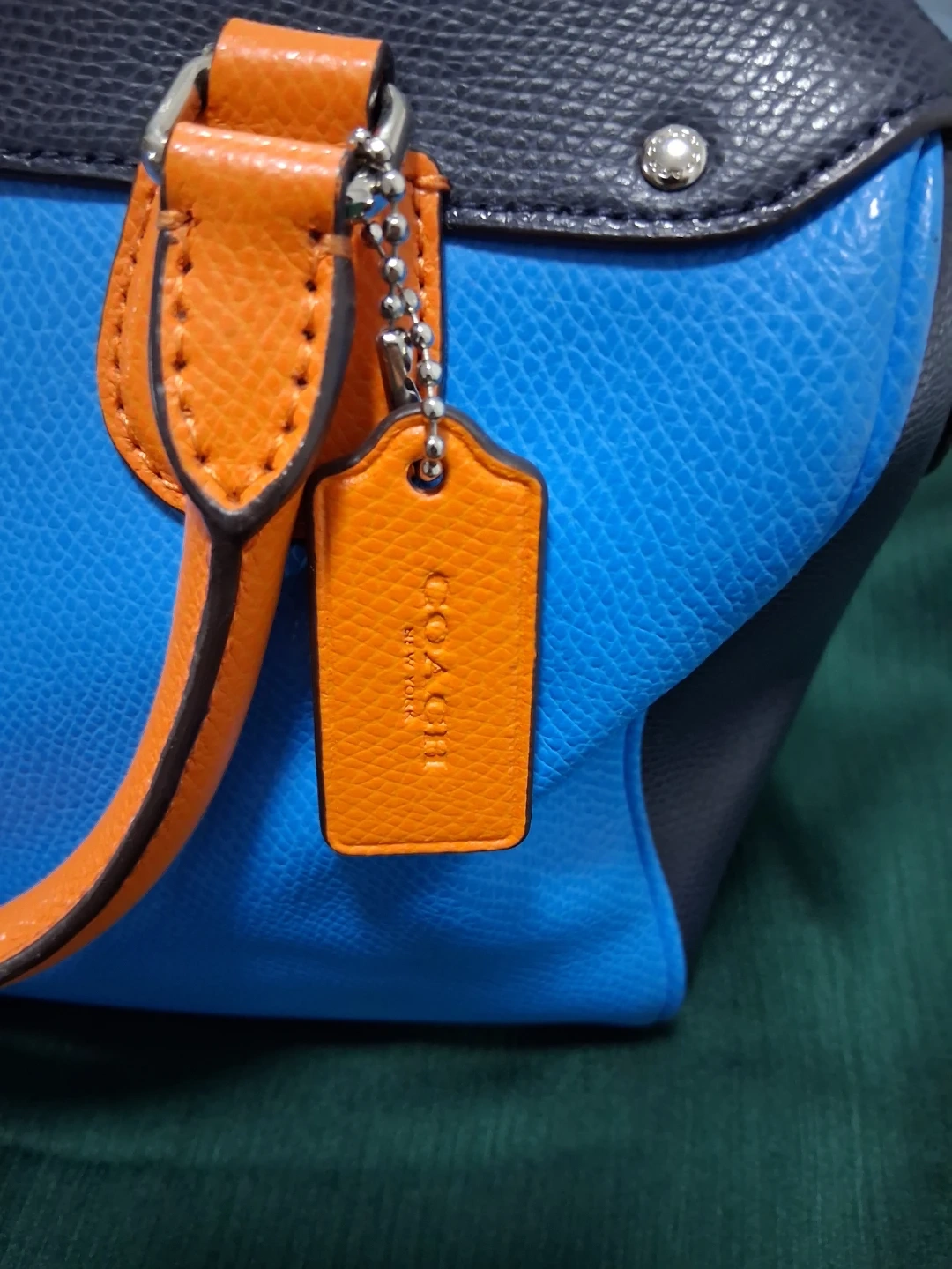5This is a stylish Coach handbag featuring a colorblock design with blue, black, and orange accents. It is in great condition and ready for a new home!
