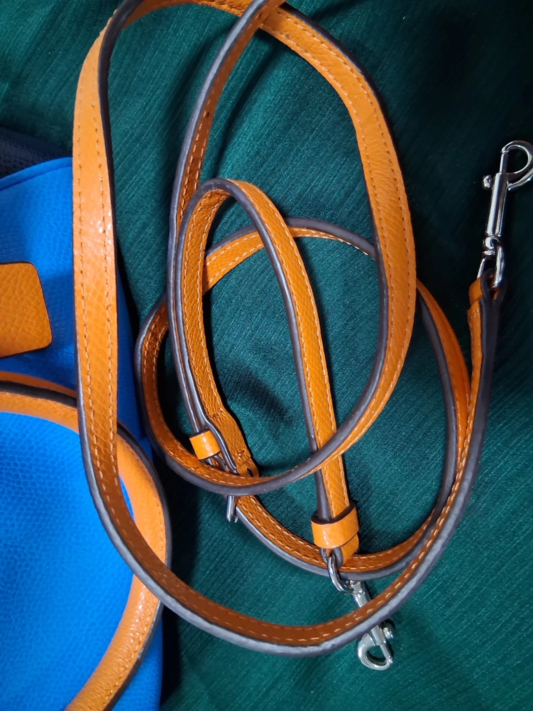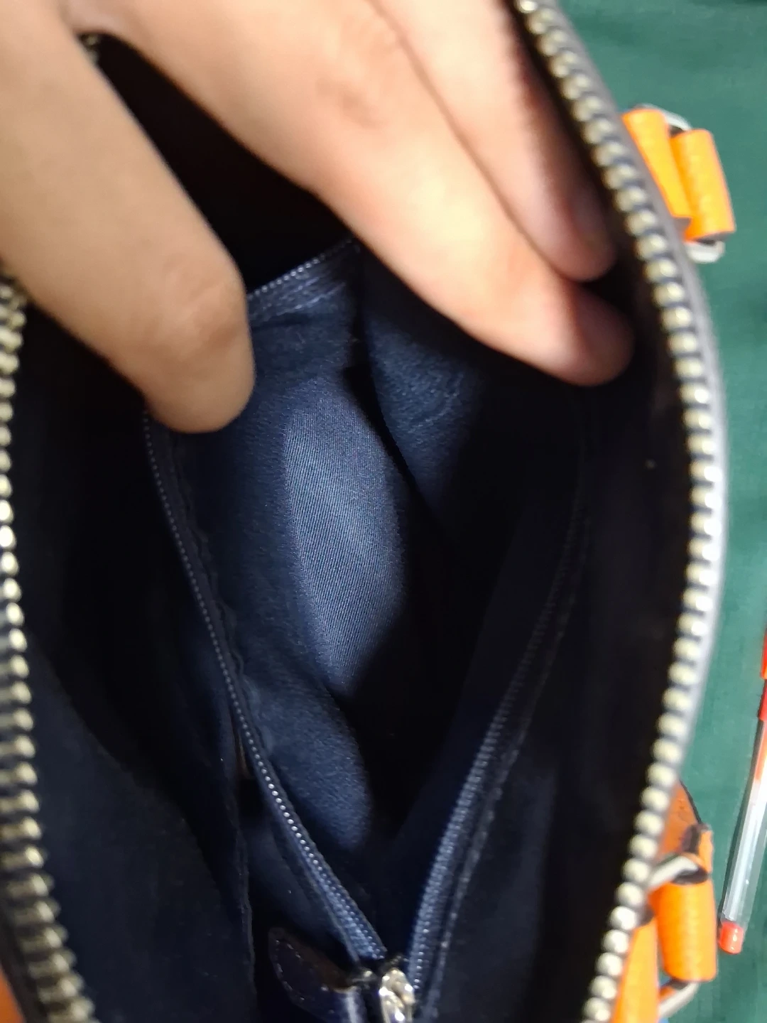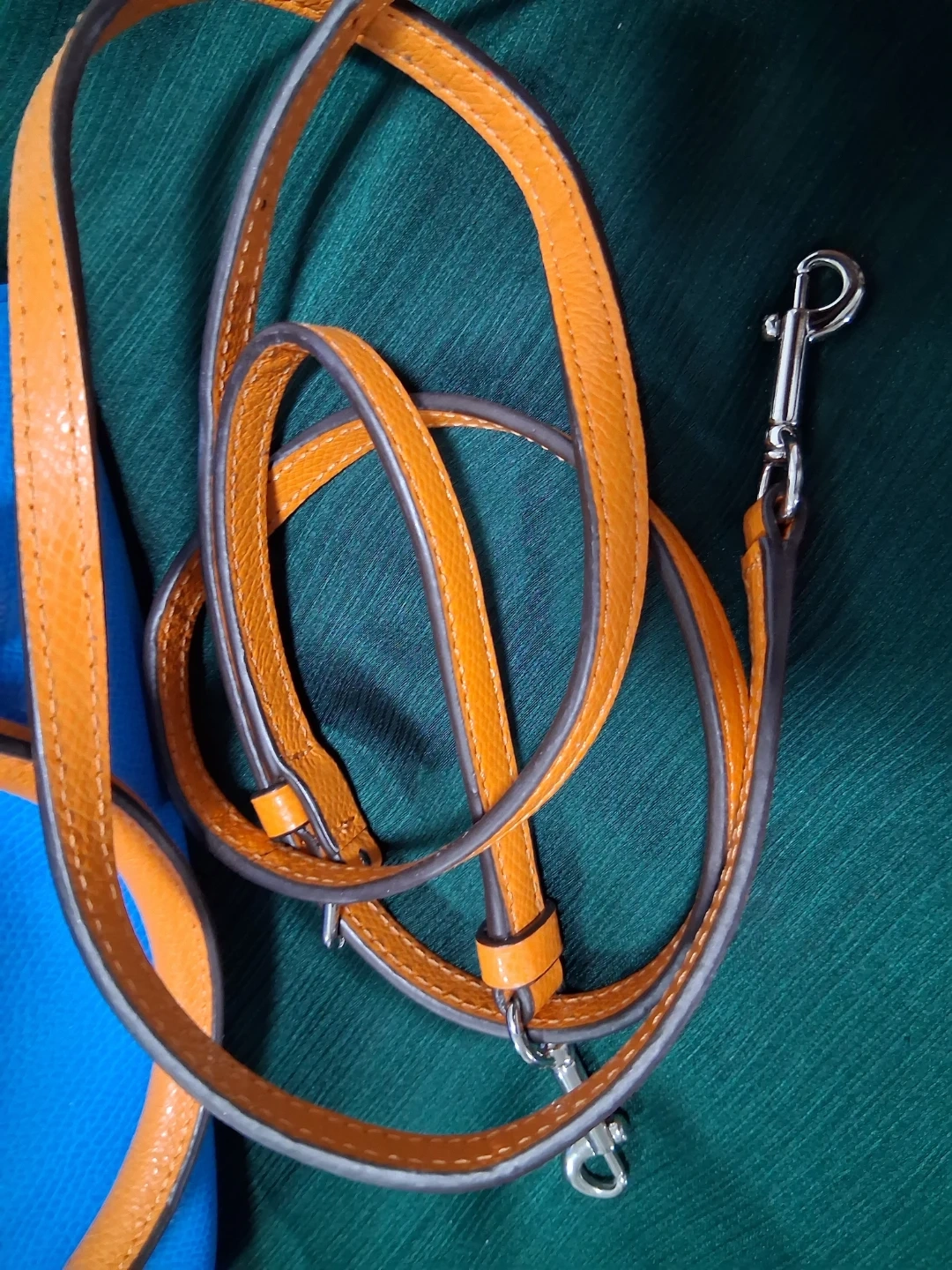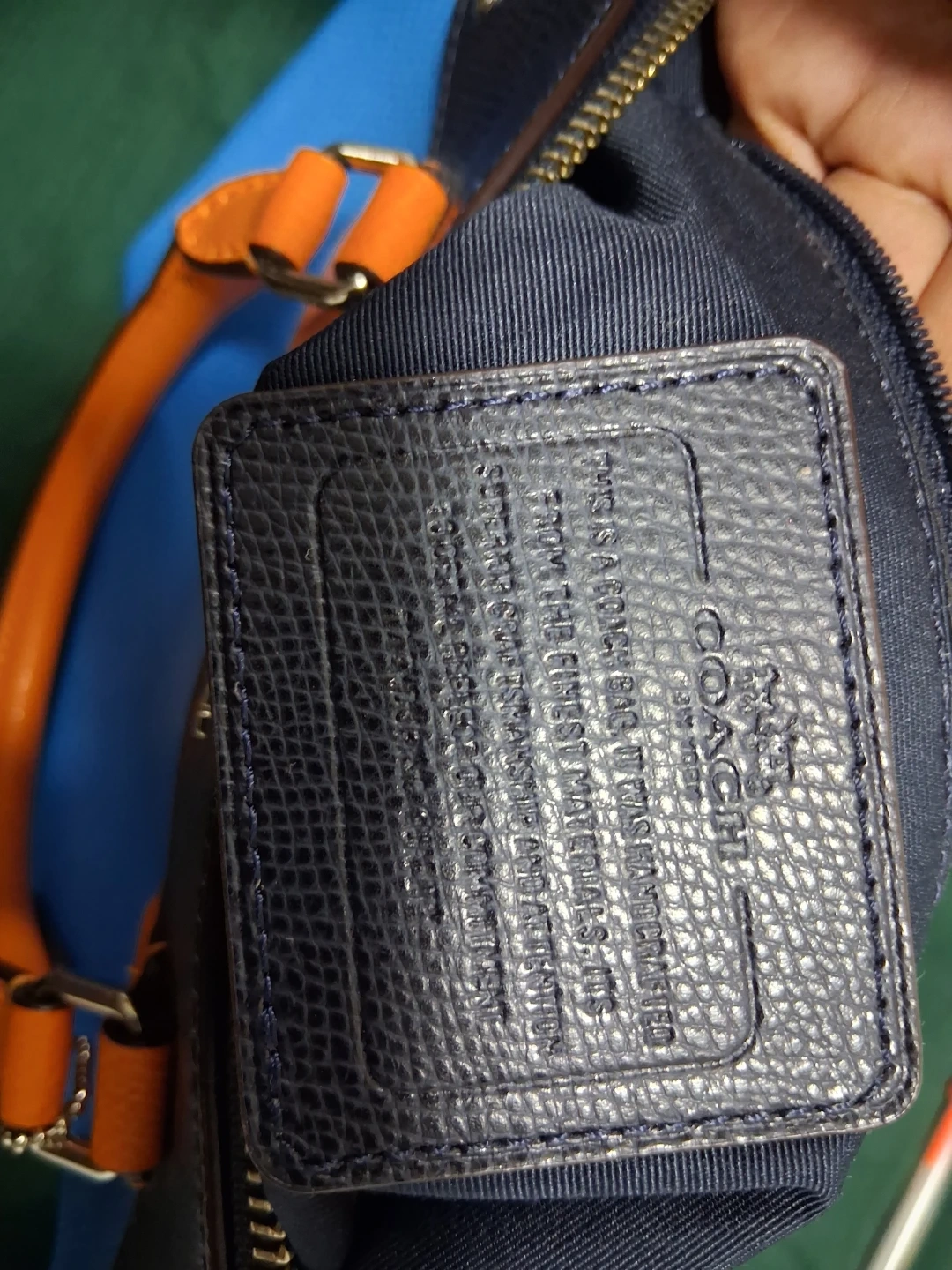 5This is a stylish Coach handbag featuring a colorblock design with blue, black, and orange accents. It is in great condition and ready for a new home!