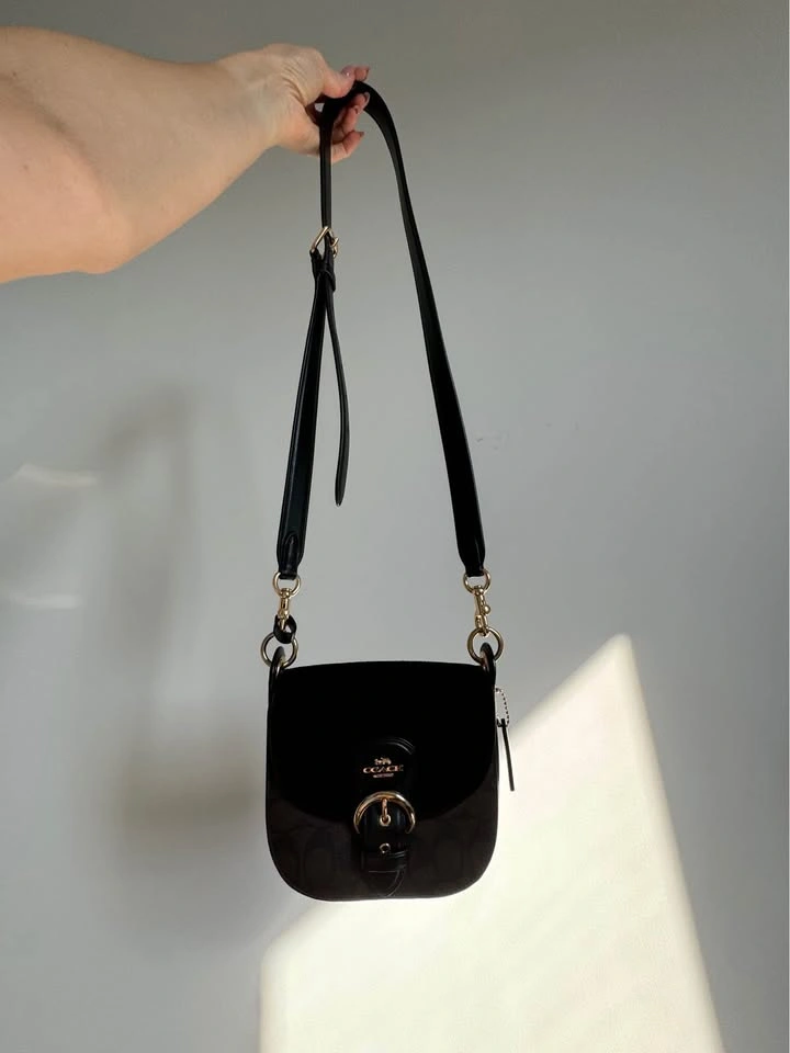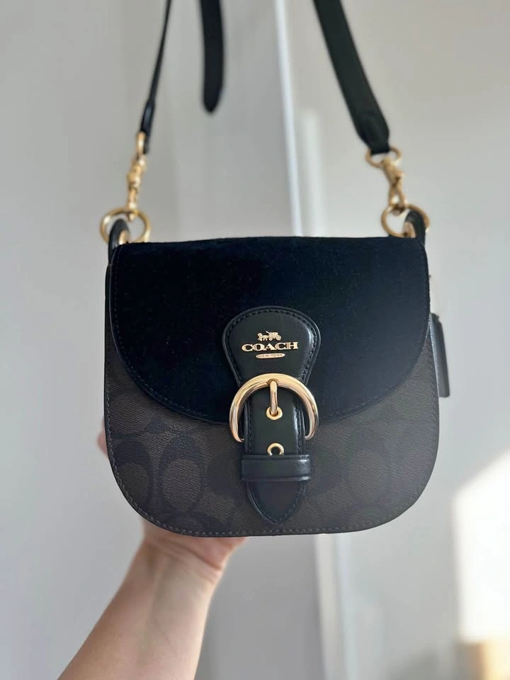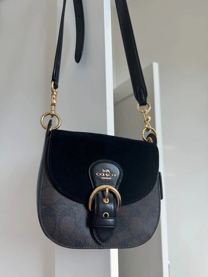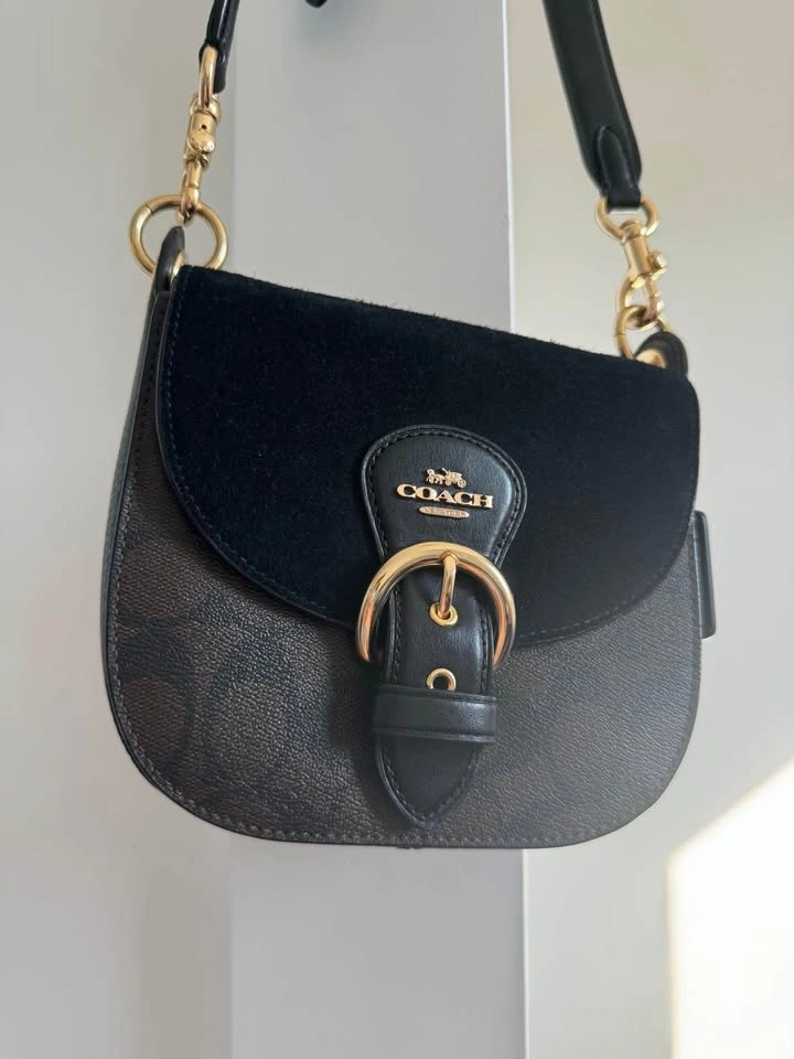 Coach shoulder bag. Made from leather and suede. Detachable handle to carry/ detachable strap for shoulder and crossbody wear. Multifunction pockets, snap closure 6 3/4"(L) x6"(H) x2 1/2"(W). Like new, Color-brown/black