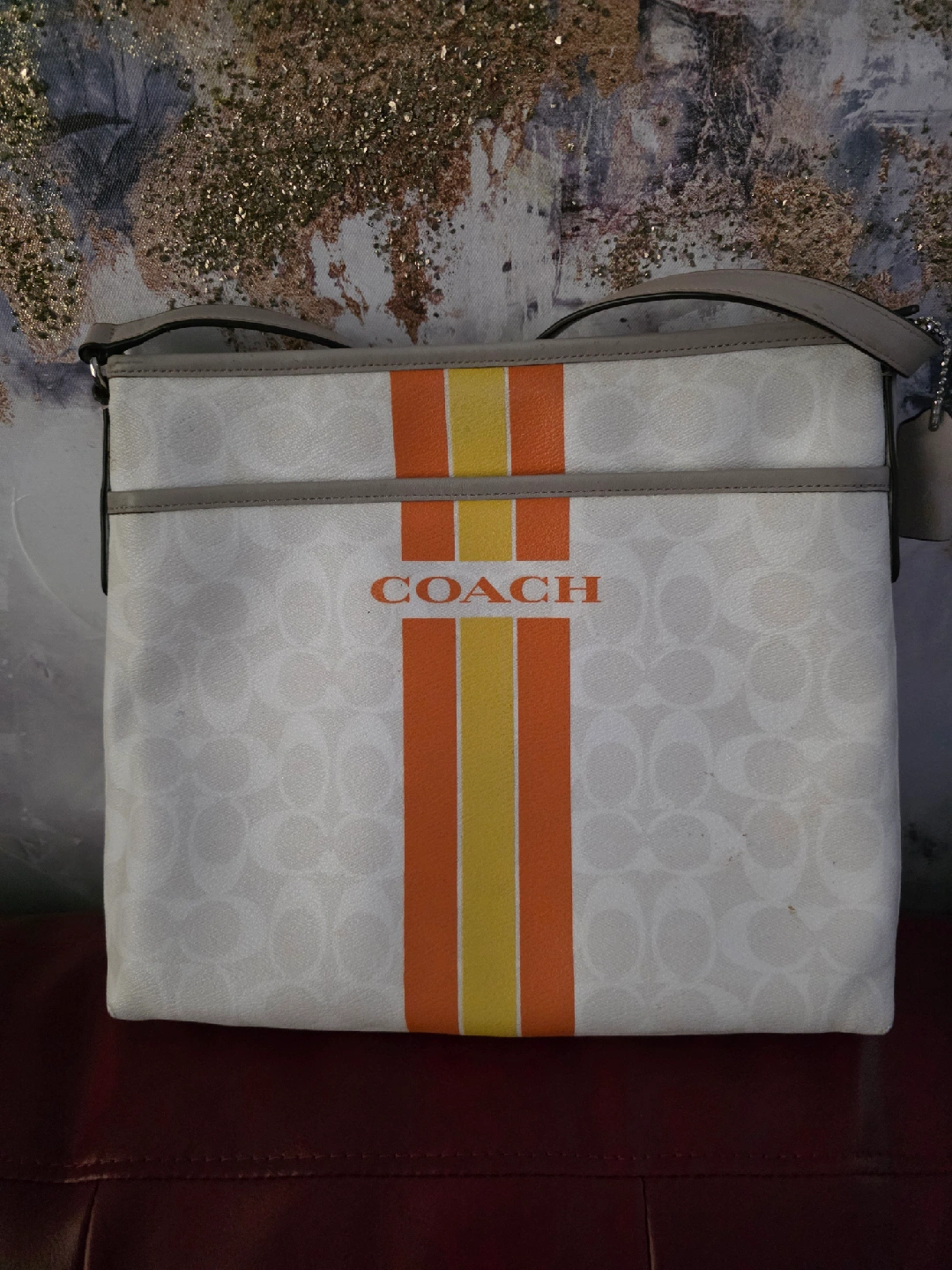 10Selling a Coach crossbody bag! It features the classic Coach logo pattern and stylish orange and yellow stripes. Perfect for everyday use