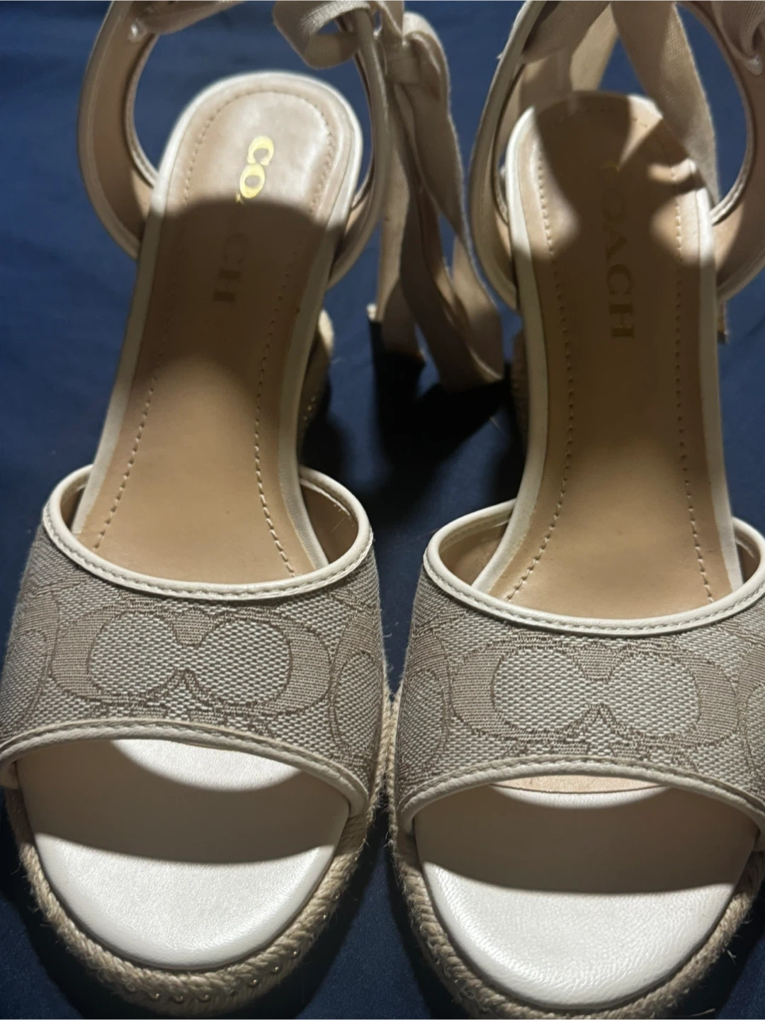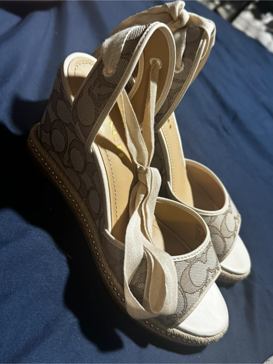 Selling a pair of Coach espadrille wedge sandals. They feature a stylish design with the Coach logo pattern. These wedges are perfect for adding a touch of elegance to your summer outfits