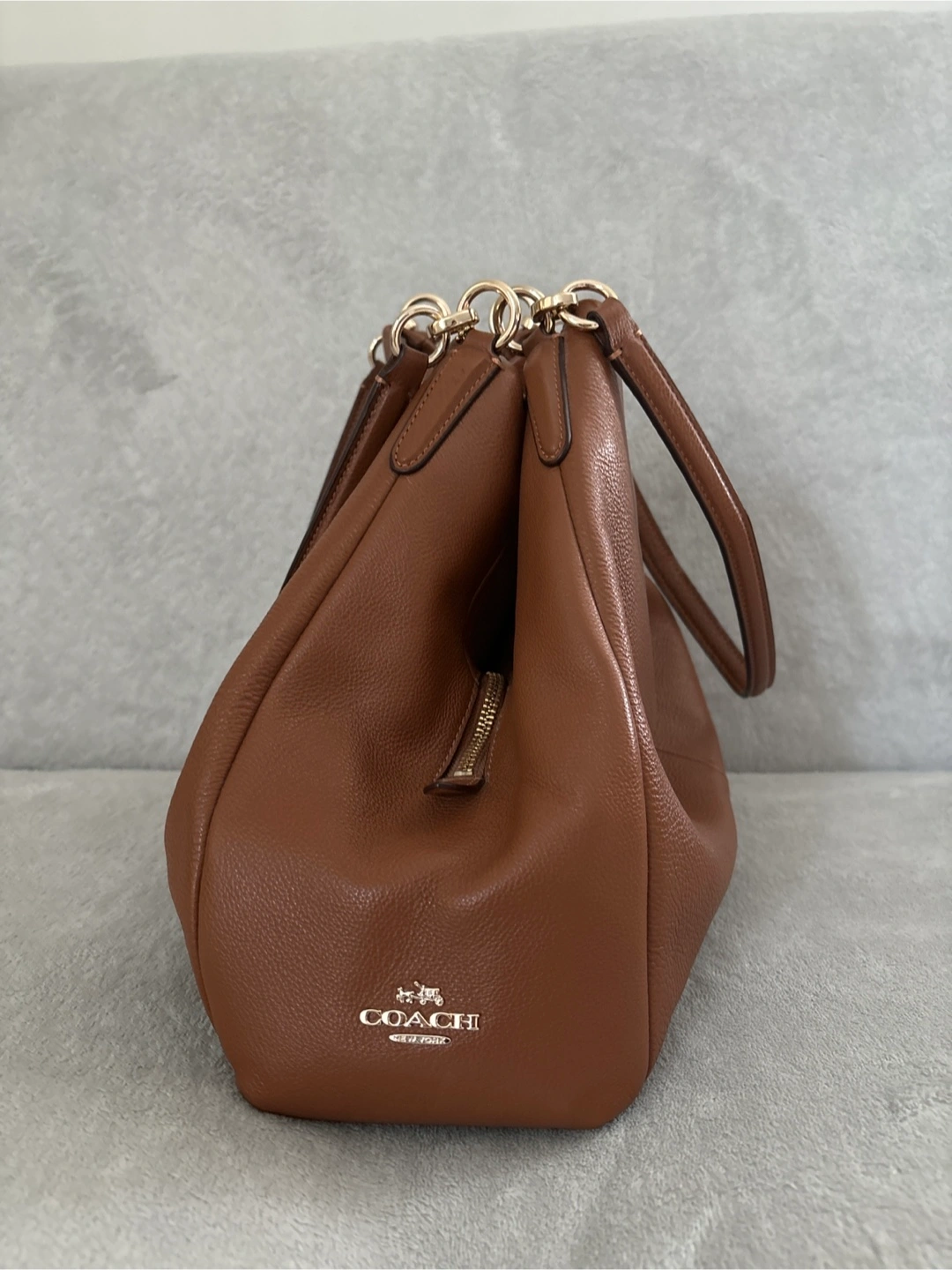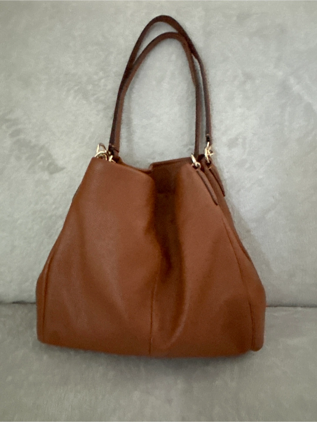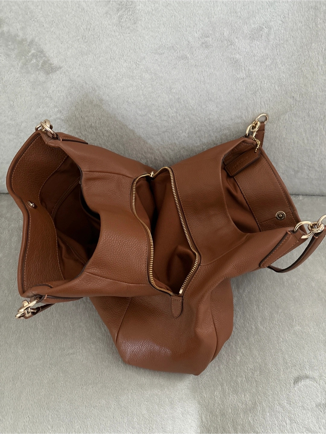 10Brown leather hobo bag. Two top handles. Zip closure. Spacious interior. Gold-tone hardware.