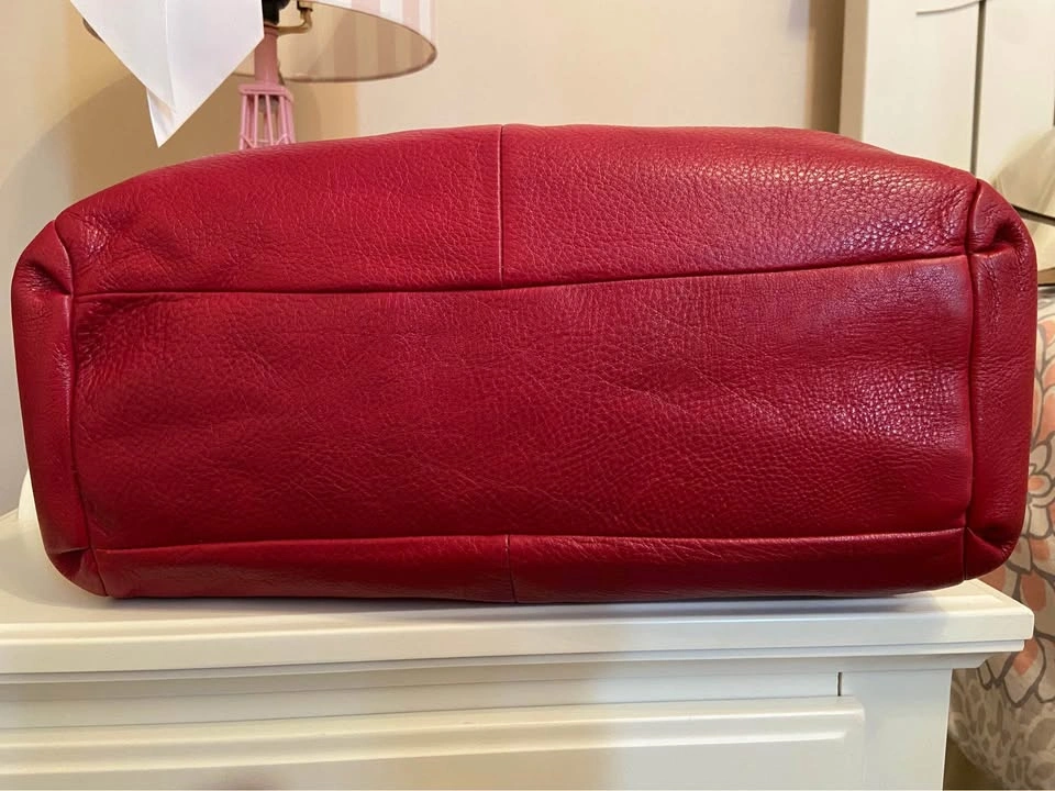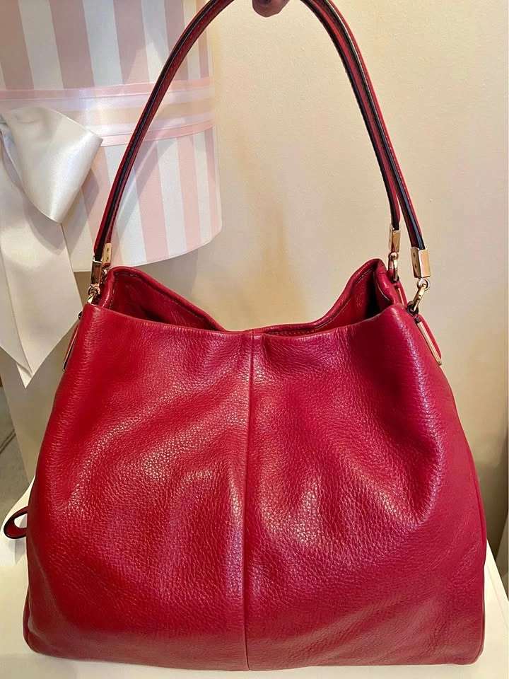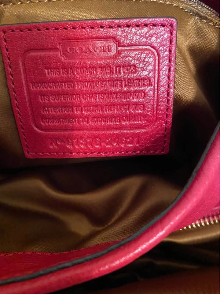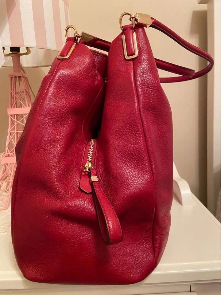 76COACH Madison Phoebe Leather Shoulder Bag, in Excellent Like-New Condition! Scarlet Red with Gold Interior. Authentic COACH bag, manufactured in 2013, purchased from the COACH store, not the outlet store. Style # 24621, serial # in photo. Original $398. Beautiful bag, very well-cared for. Bag is very clean, dust-free, and has been carefully stored. One owner, my Mom. This bag is known for its soft, slouchy silhouette. Bag is all pebbled leather construction. Exterior is in excellent condition, no rips, holes or stains. Features a triple-compartment interior design with a zippered middle section, and two open side compartments…with magnetic top snap-closure. Zipper works perfectly. Inside zip, cell phone, and multifunction pockets. Fully-lined, gold sateen fabric lining in excellent condition, no stains, holes, tears or pen marks. Double leather top handles, in perfect condition, no staining or dark areas. Gold hardware, all in excellent condition. Has both original leather, and gold metal hang tags. One small surface scratch to the bottom of bag, seen in last photo. No visible signs of wear. No scuffing to edges of bag. No stains, no rips, no holes. Bag is in excellent condition! Comes with COACH dust bag. Approx Measurements: 15” Long, 13-1/4” High, 6” Deep. 9” Handle Drop. Cash only. Meet in Garfield Ridge, Chicago, near Midway. Willing to meet near Oak Lawn ,EP, Alsip, Orland, Palos, Burbank, Bridgeview, Countryside, LaGrange, Burr Ridge, Darien ☺️