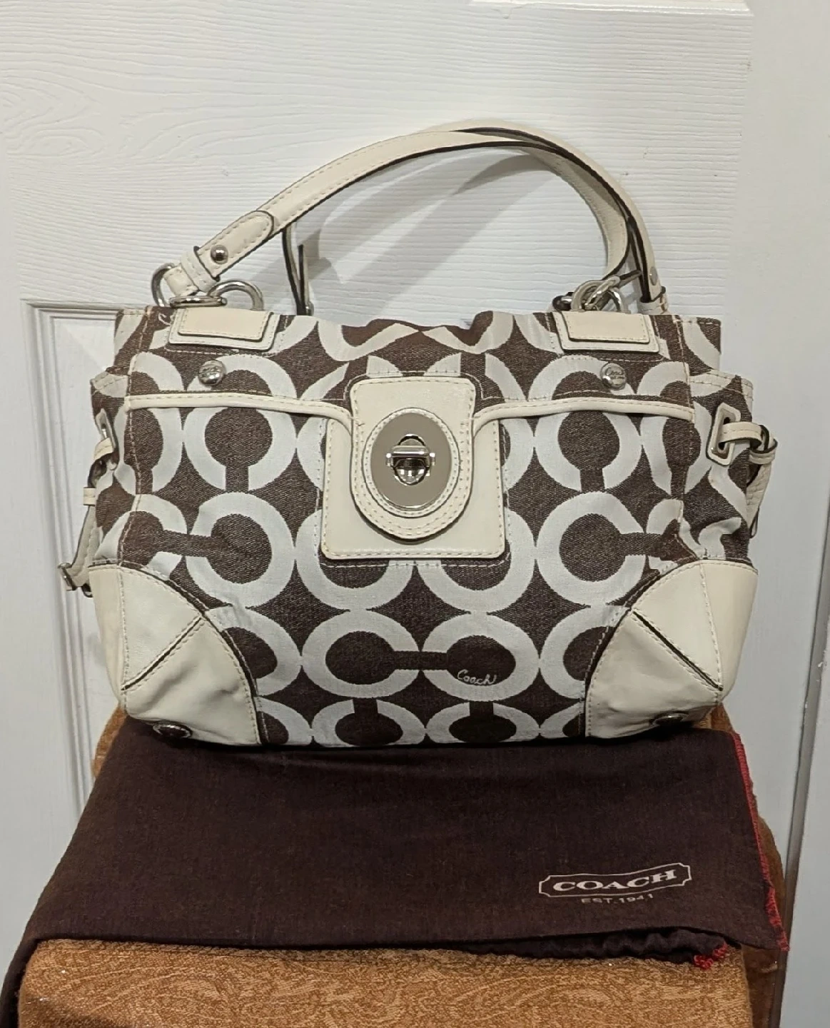 152This is a beautiful and classic Coach satchel from the popular "Op Art" collection. The bag features a striking brown and white signature canvas print with contrasting off-white or cream leather trim and handles. It has a turn-lock closure on the front pocket and a spacious interior. The bag is in excellent, gently used condition with a clean interior and no major flaws. It comes with its original Coach dust bag, which is great for storage and helps protect the bag. This is a perfect everyday bag for a Coach fan!